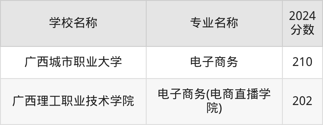 | 广西理工职业技术学院 | 电子商务 | 210 |