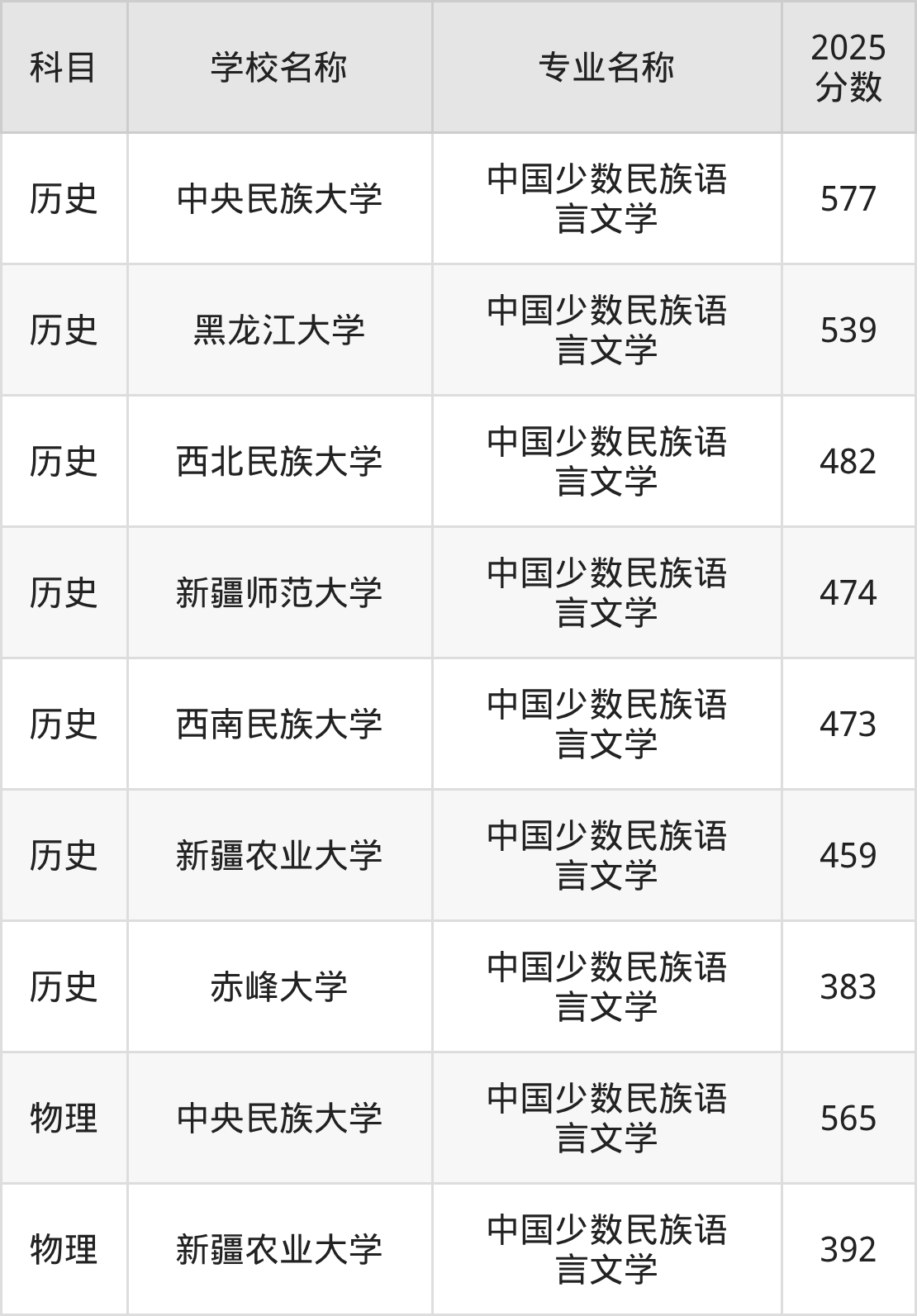 通过上文大家可以知晓,在吉林省内招中国少数民族语言文学专业的院校数量较少,所以下文将为2026届高考生继续展示:省外大学的中国少数民族语言文学专业2025年在吉林高考的录取情况,包含中央民族大学、黑龙江大学、西北民族大学、新疆师范大学、西南民族大学。