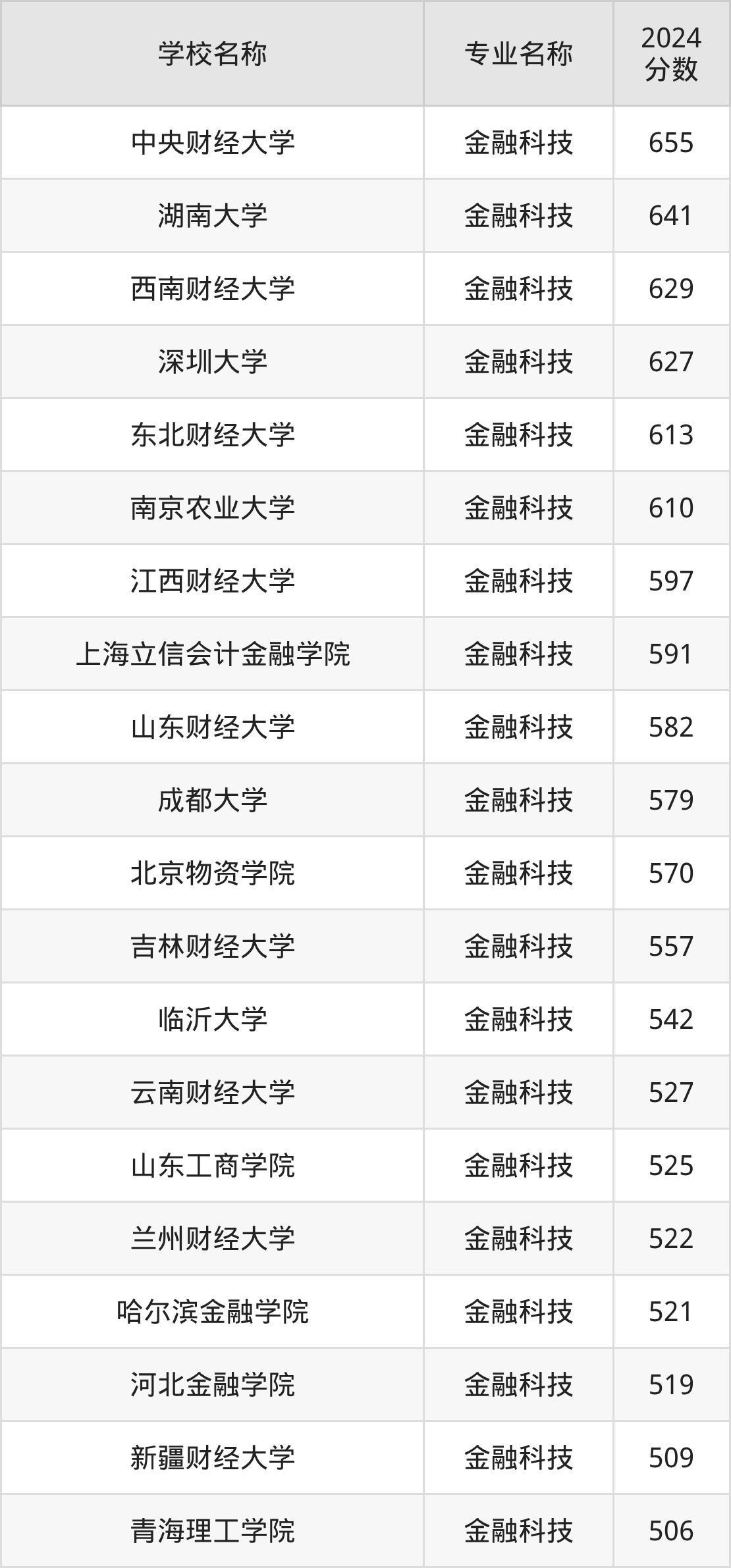 通过上文大家可以知晓,在天津市内招金融科技专业的院校数量较少,所以下文将为2026届高考生继续展示:市外大学的金融科技专业2024年在天津高考的录取情况,包含中央财经大学、湖南大学、西南财经大学、深圳大学、东北财经大学。