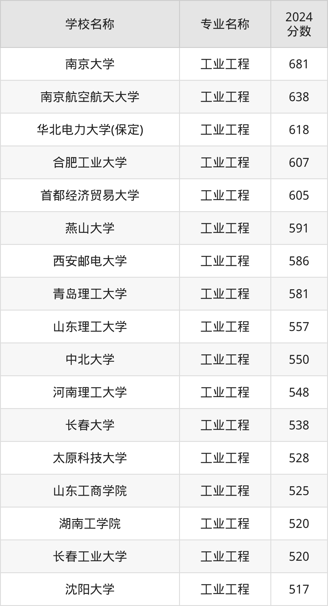 通过上文大家可以知晓,在天津市内招工业工程专业的院校数量较少,所以下文将为2026届高考生继续展示:市外大学的工业工程专业2024年在天津高考的录取情况,包含南京大学、南京航空航天大学、华北电力大学(保定)、合肥工业大学、首都经济贸易大学。
