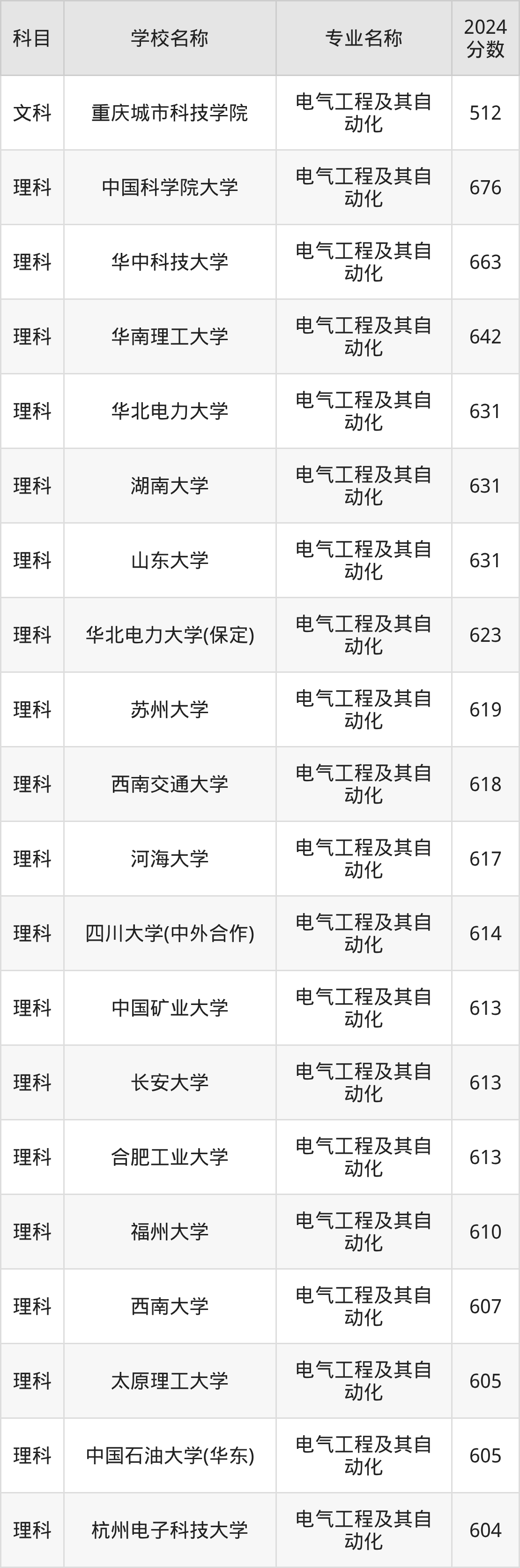 通过上文大家可以知晓,在云南省内招电气工程及其自动化专业的院校数量较少,所以下文将为2026届高考生继续展示:省外大学的电气工程及其自动化专业2024年在云南高考的录取情况,包含重庆城市科技学院、中国科学院大学、华中科技大学、华南理工大学、华北电力大学。