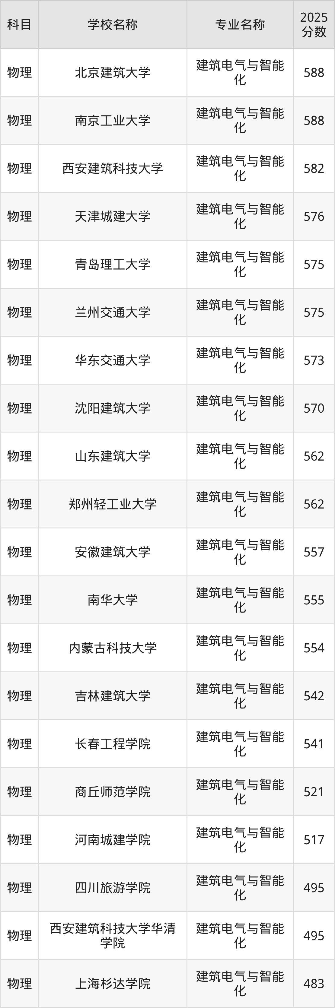 通过上文大家可以知晓,在河北省内招建筑电气与智能化专业的院校数量较少,所以下文将为2026届高考生继续展示:省外大学的建筑电气与智能化专业2025年在河北高考的录取情况,包含北京建筑大学、南京工业大学、西安建筑科技大学、天津城建大学、青岛理工大学。