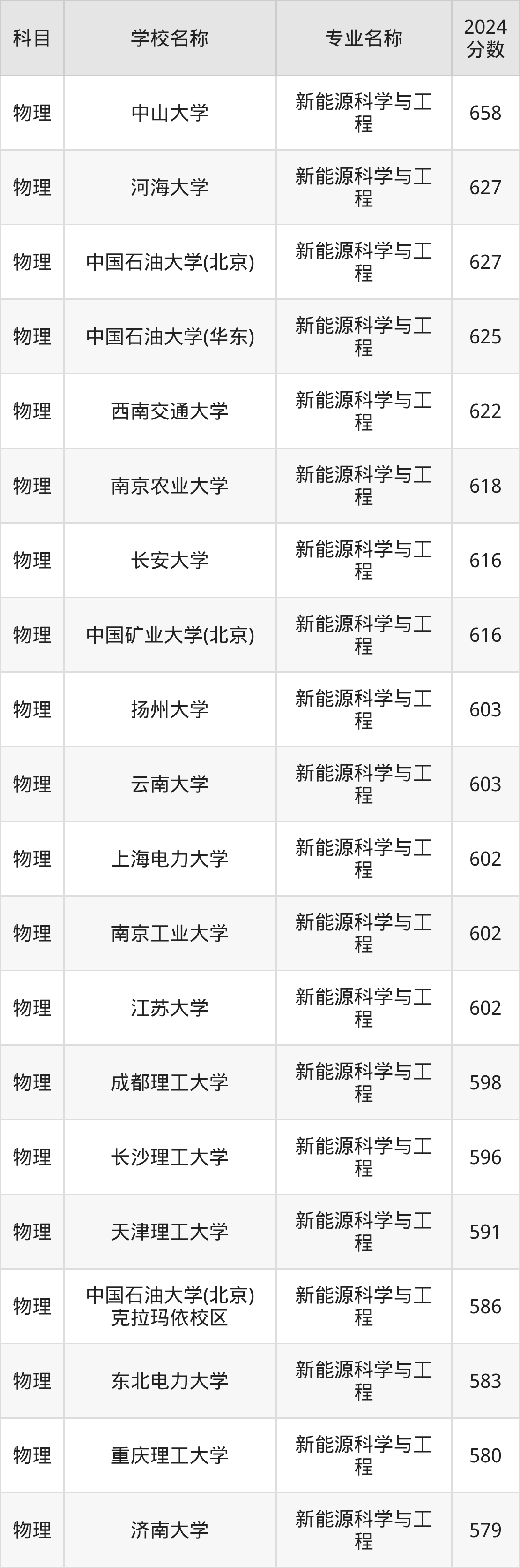 通过上文大家可以知晓,在安徽省内招新能源科学与工程专业的院校数量较少,所以下文将为2026届高考生继续展示:省外大学的新能源科学与工程专业2024年在安徽高考的录取情况,包含中山大学、河海大学、中国石油大学(北京)、中国石油大学(华东)、西南交通大学。