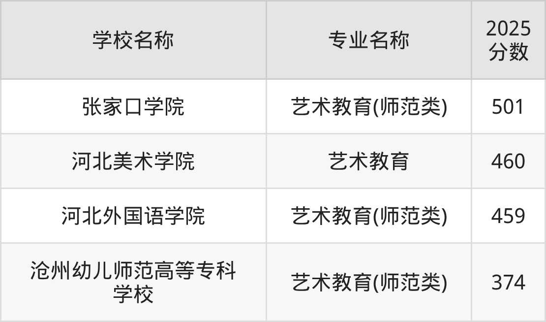 圆梦小编根据河北2025年高考历史组专业分,将开设了艺术教育专业且位于河北省内的大学按照“录取分”从高到低排序,得出了以上榜单。