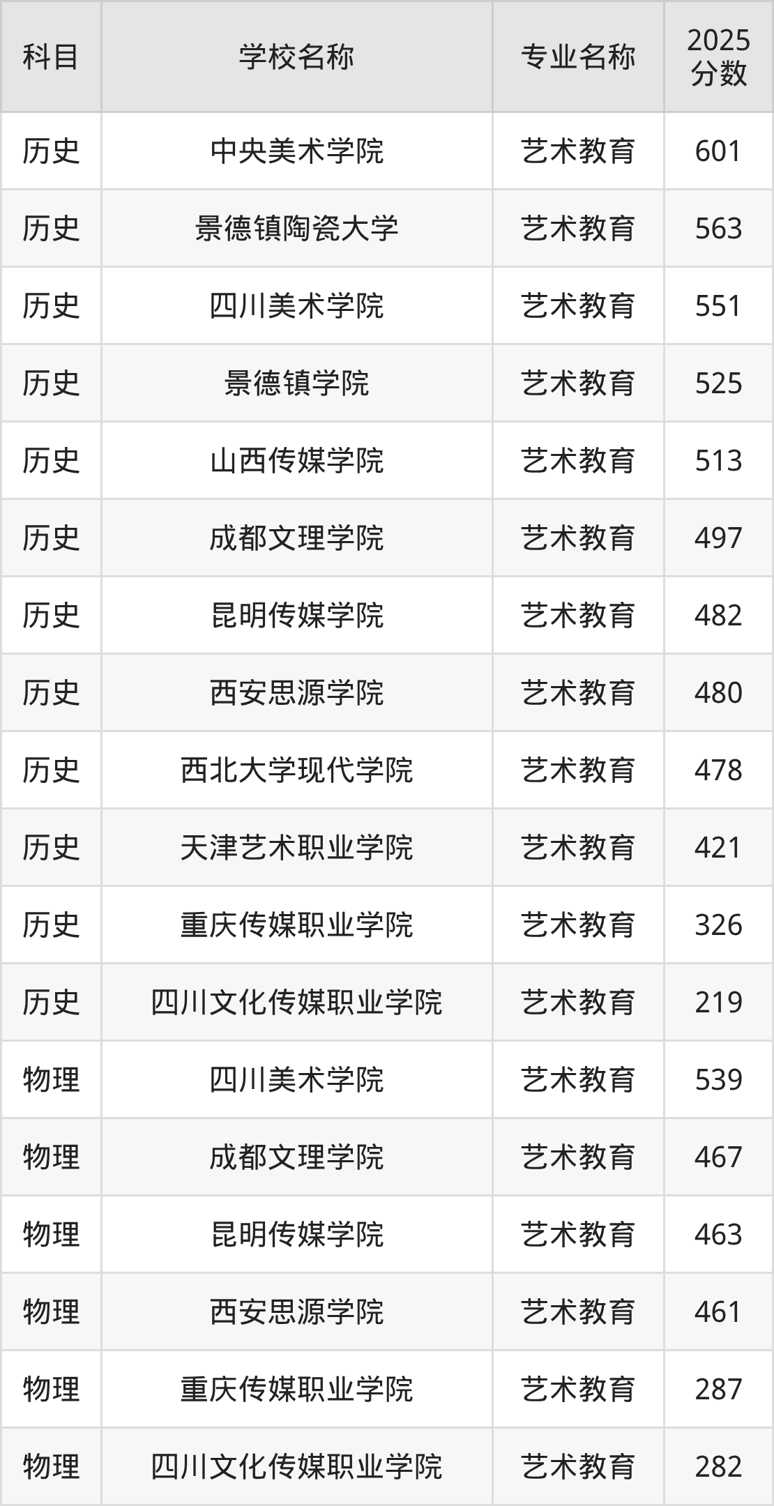 通过上文大家可以知晓,在河北省内招艺术教育专业的院校数量较少,所以下文将为2026届高考生继续展示:省外大学的艺术教育专业2025年在河北高考的录取情况,包含中央美术学院、景德镇陶瓷大学、四川美术学院、景德镇学院、山西传媒学院。