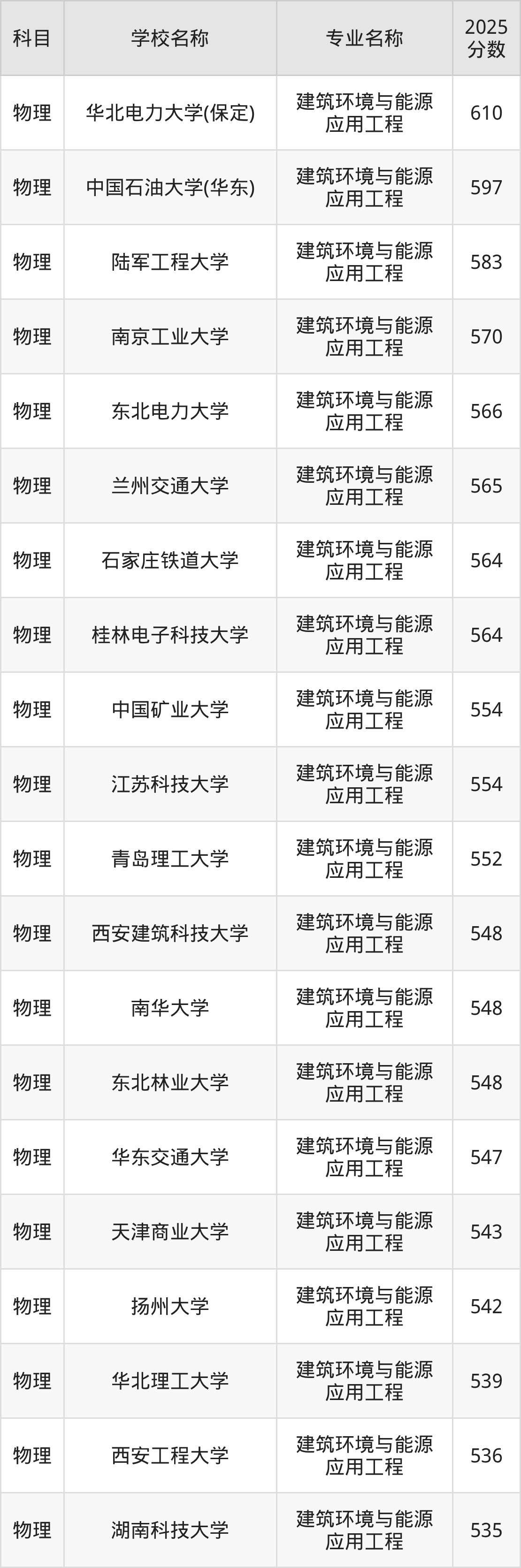 通过上文大家可以知晓,在山西省内招建筑环境与能源应用工程专业的院校数量较少,所以下文将为2026届高考生继续展示:省外大学的建筑环境与能源应用工程专业2025年在山西高考的录取情况,包含华北电力大学(保定)、中国石油大学(华东)、陆军工程大学、南京工业大学、东北电力大学。
