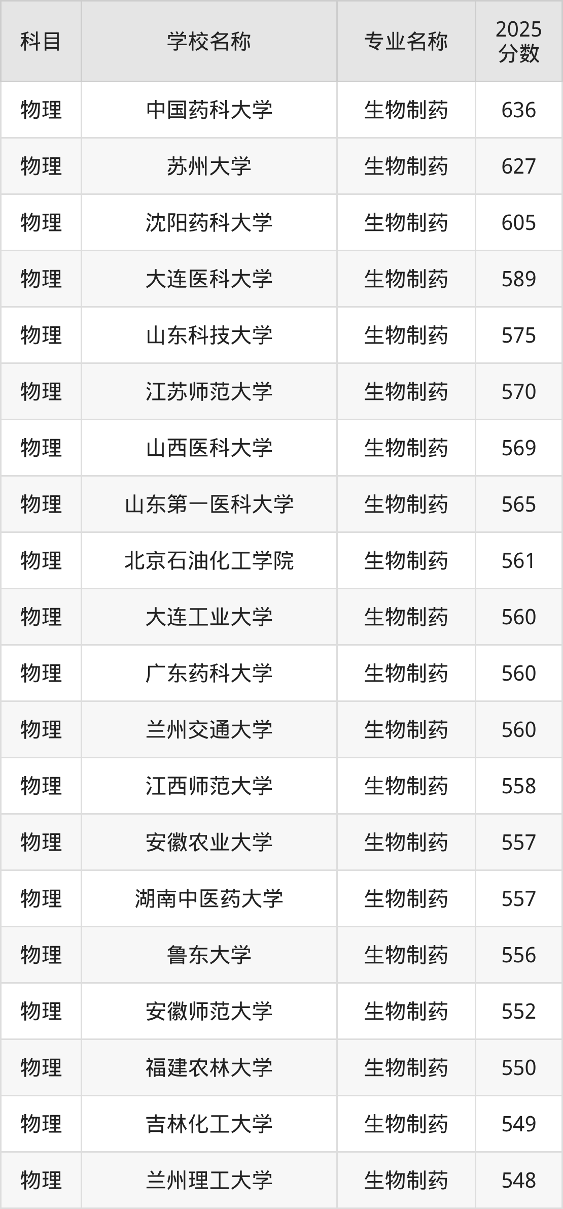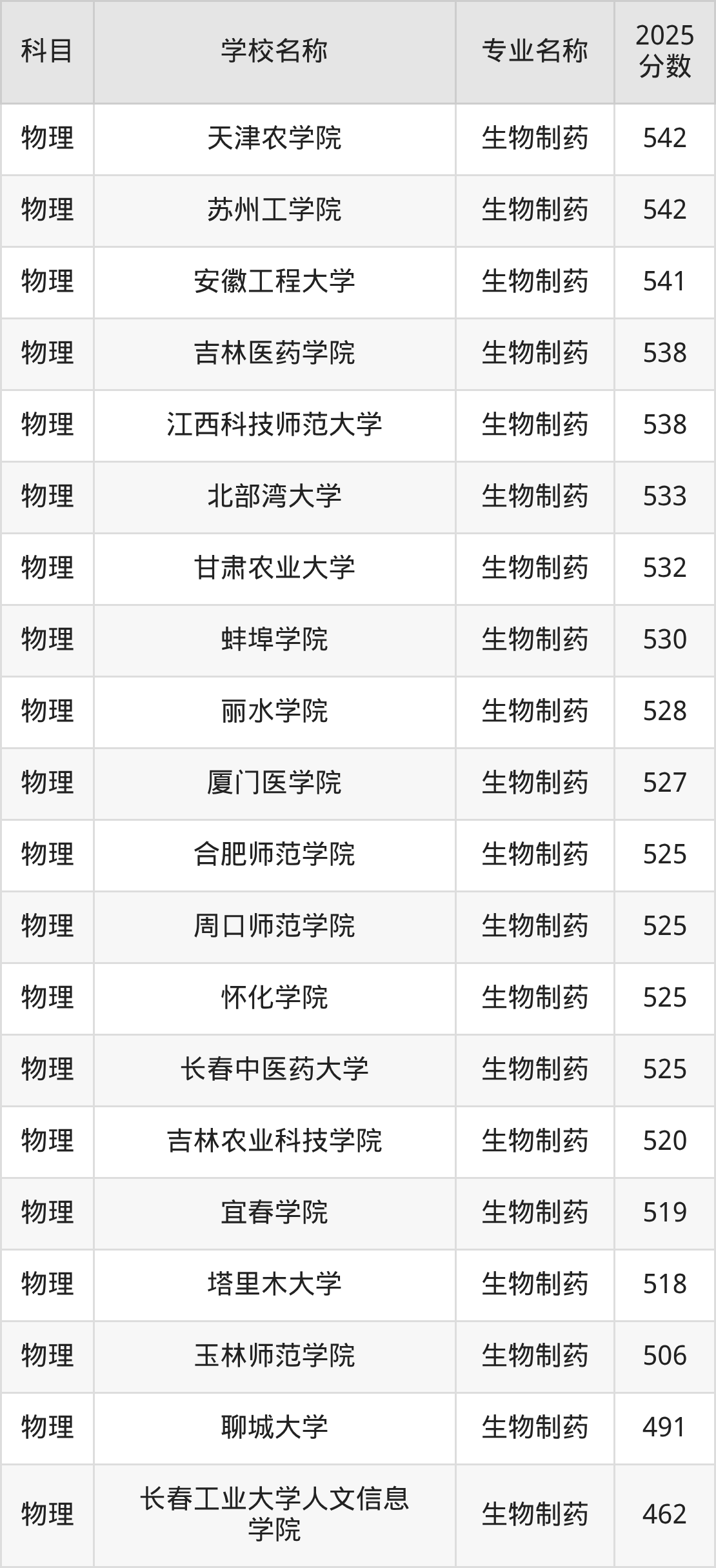 通过上文大家可以知晓,在河北省内招生物制药专业的院校数量较少,所以下文将为2026届高考生继续展示:省外大学的生物制药专业2025年在河北高考的录取情况,包含中国药科大学、苏州大学、沈阳药科大学、大连医科大学、山东科技大学。