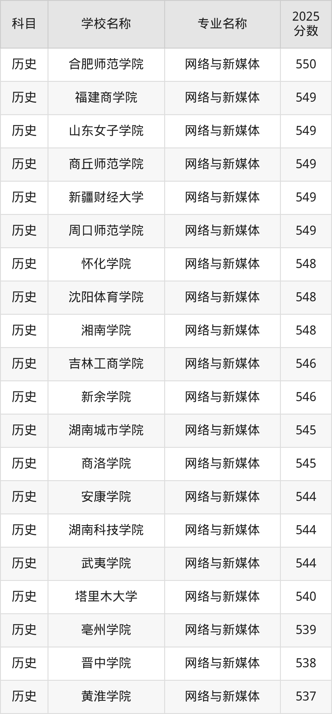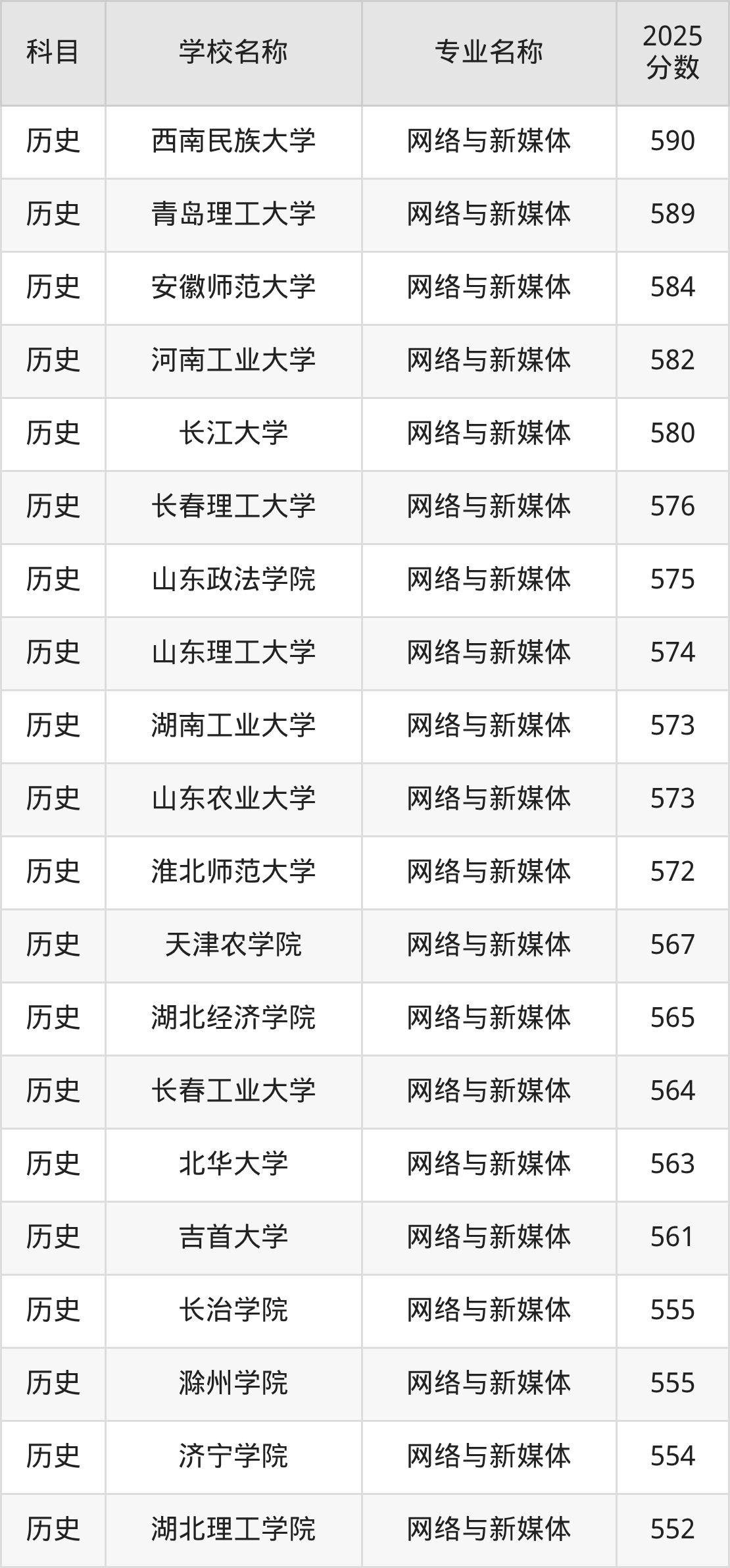 河北高考历史组:网络与新媒体专业的最低分是486分~561分
