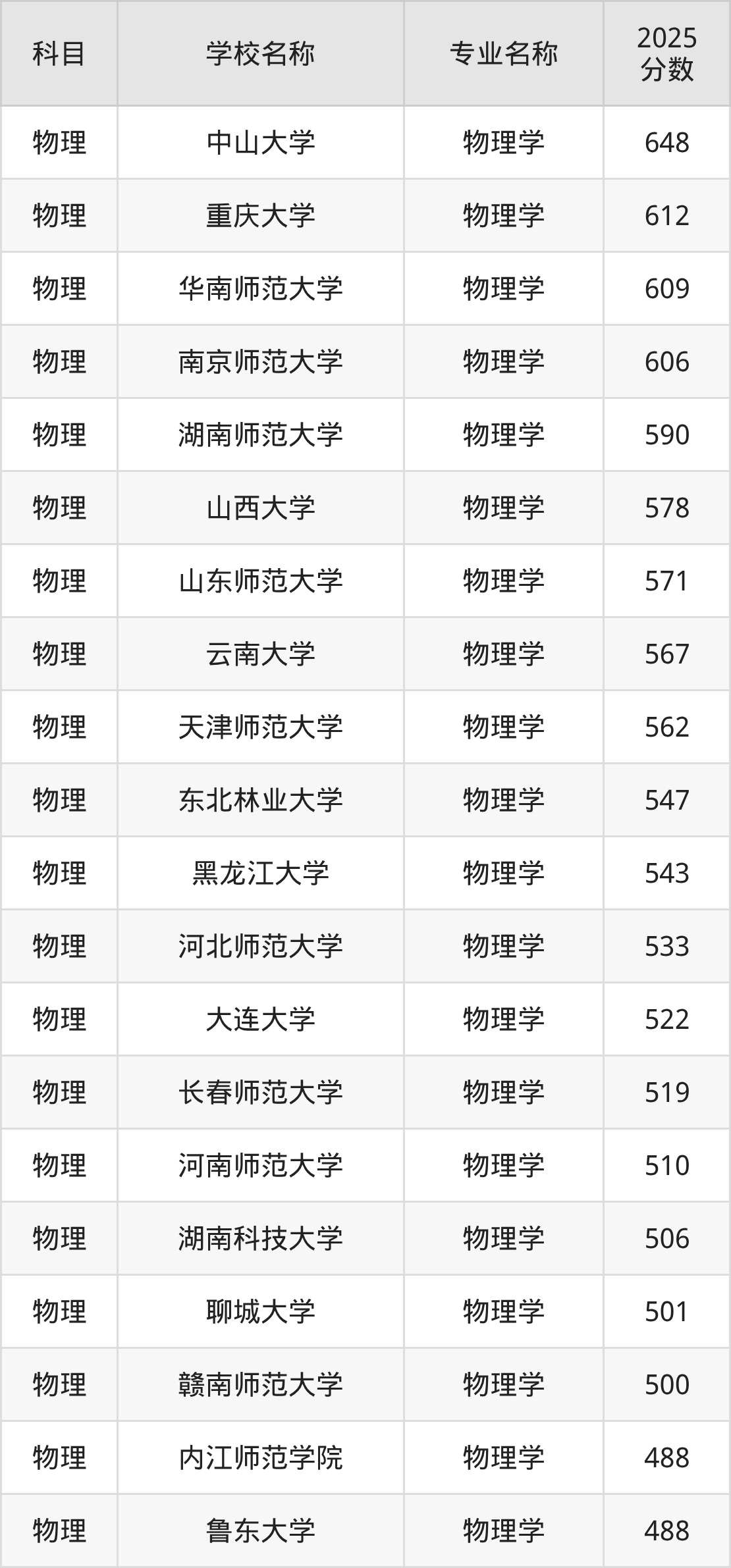 | 内蒙古师范大学 | 物理学(师范类) | 495 |
