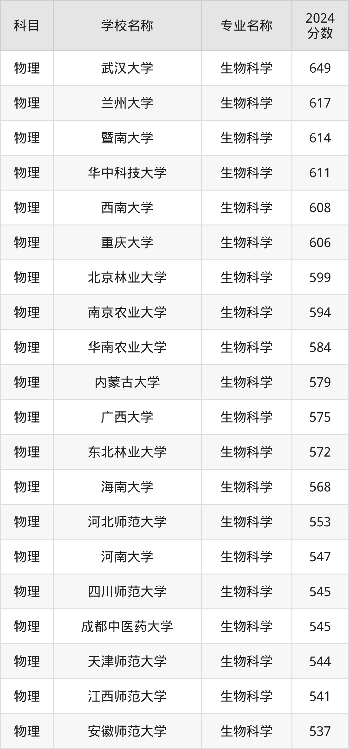 通过上文大家可以知晓,在湖南省内招生物科学专业的院校数量较少,所以下文将为2026届高考生继续展示:省外大学的生物科学专业2024年在湖南高考的录取情况,包含武汉大学、兰州大学、暨南大学、华中科技大学、西南大学。
