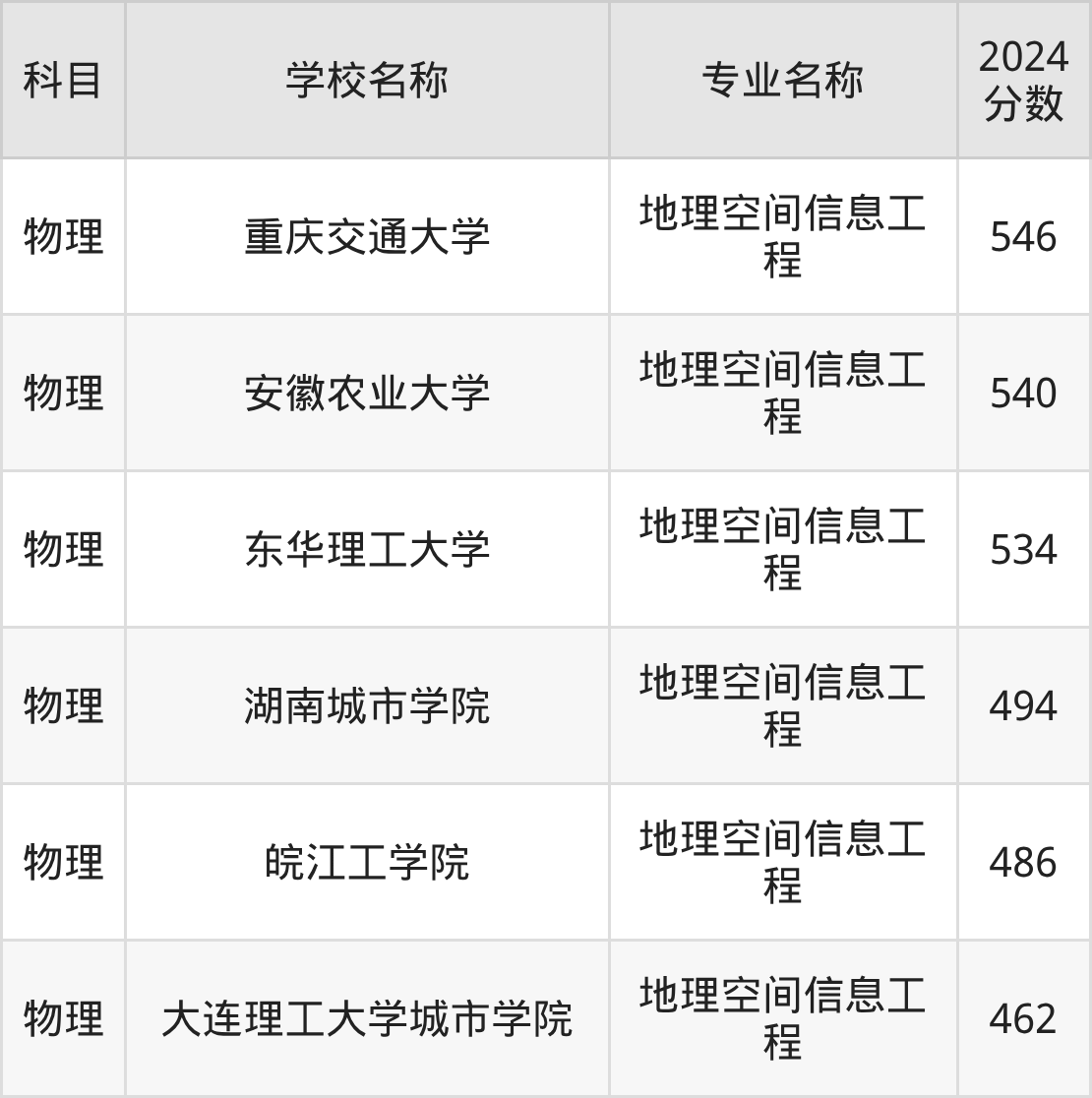 通过上文大家可以知晓,在江苏省内招地理空间信息工程专业的院校数量较少,所以下文将为2026届高考生继续展示:省外大学的地理空间信息工程专业2024年在江苏高考的录取情况,包含重庆交通大学、安徽农业大学、东华理工大学、湖南城市学院、皖江工学院。