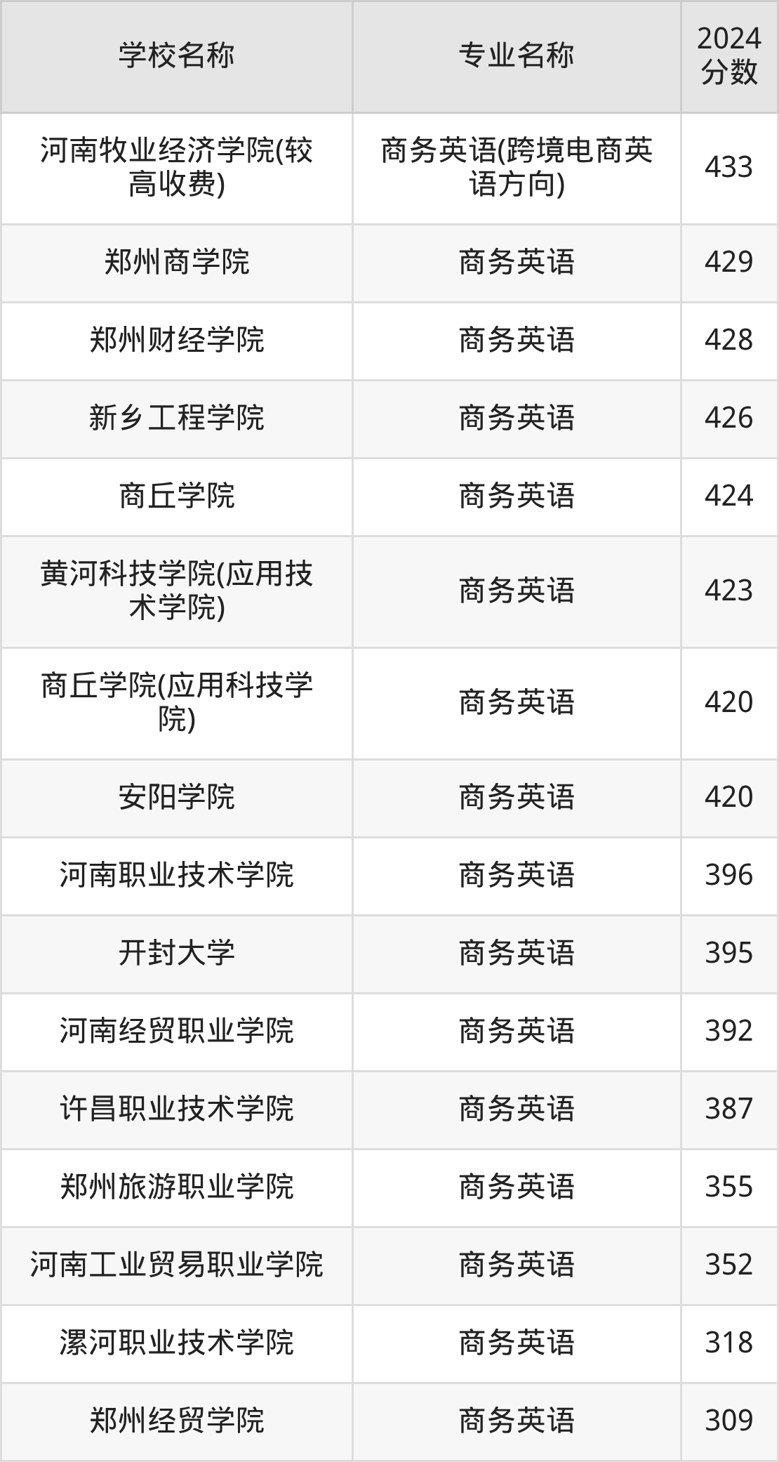 | 河南经贸职业学院 | 商务英语 | 410 |