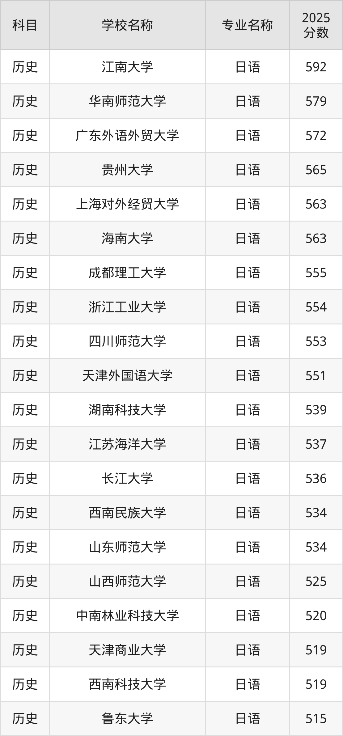 通过上文大家可以知晓,在重庆市内招日语专业的院校数量较少,所以下文将为2026届高考生继续展示:市外大学的日语专业2025年在重庆高考的录取情况,包含江南大学、华南师范大学、广东外语外贸大学、贵州大学、上海对外经贸大学。