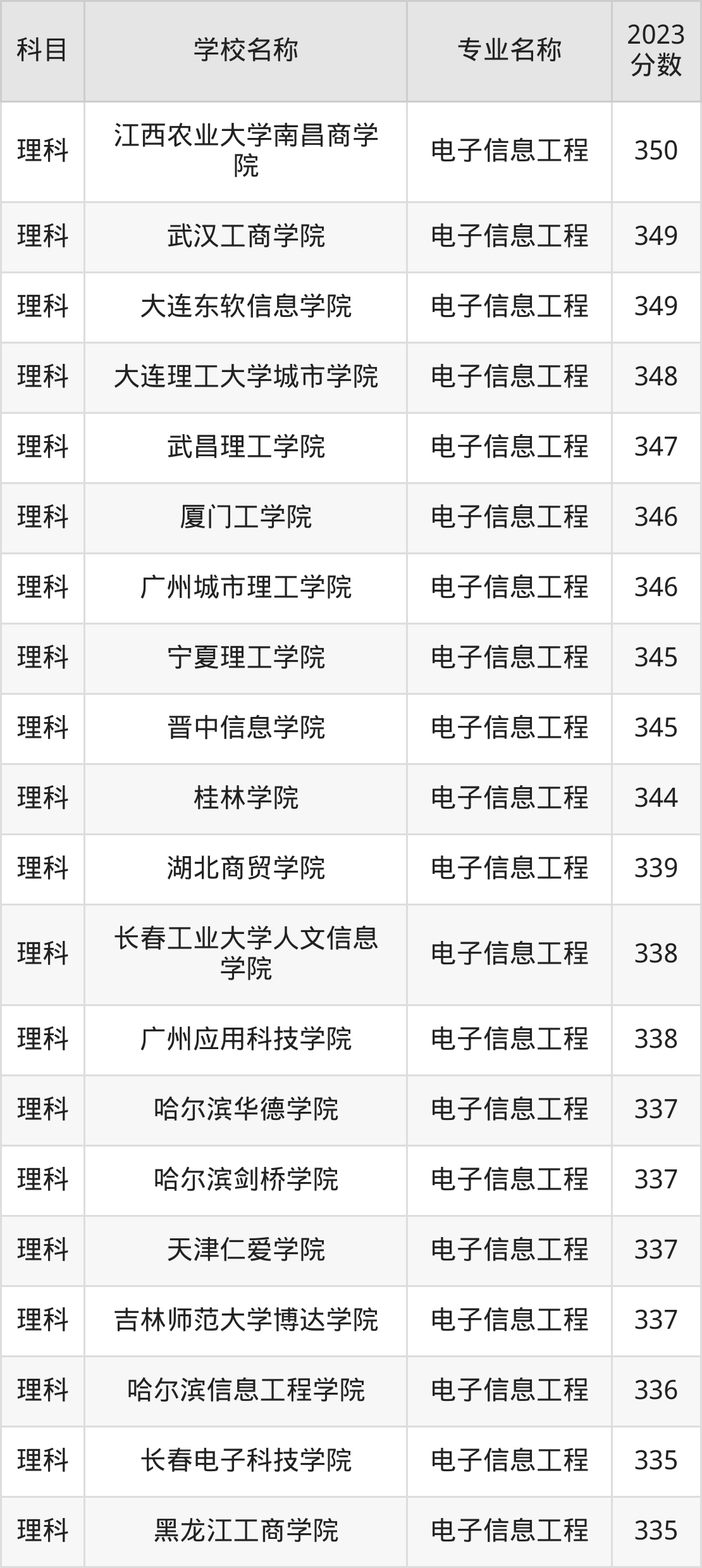 | 呼伦贝尔学院(校企合 作和中外合作) | 电子信息工程( 通信) | 349 |