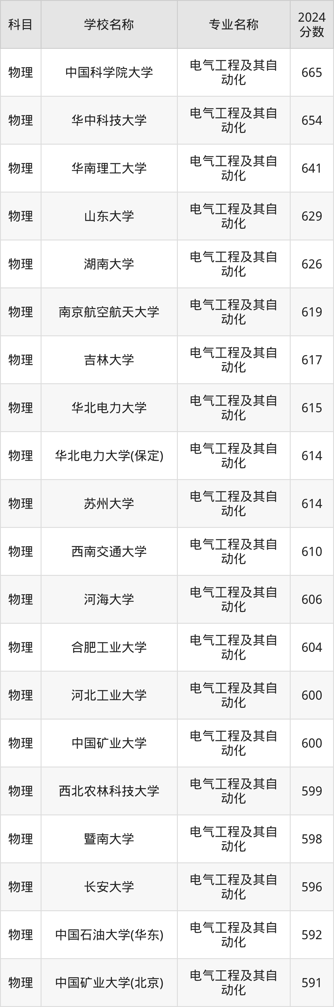 通过上文大家可以知晓,在甘肃省内招电气工程及其自动化专业的院校数量较少,所以下文将为2026届高考生继续展示:省外大学的电气工程及其自动化专业2024年在甘肃高考的录取情况,包含中国科学院大学、华中科技大学、华南理工大学、山东大学、湖南大学。