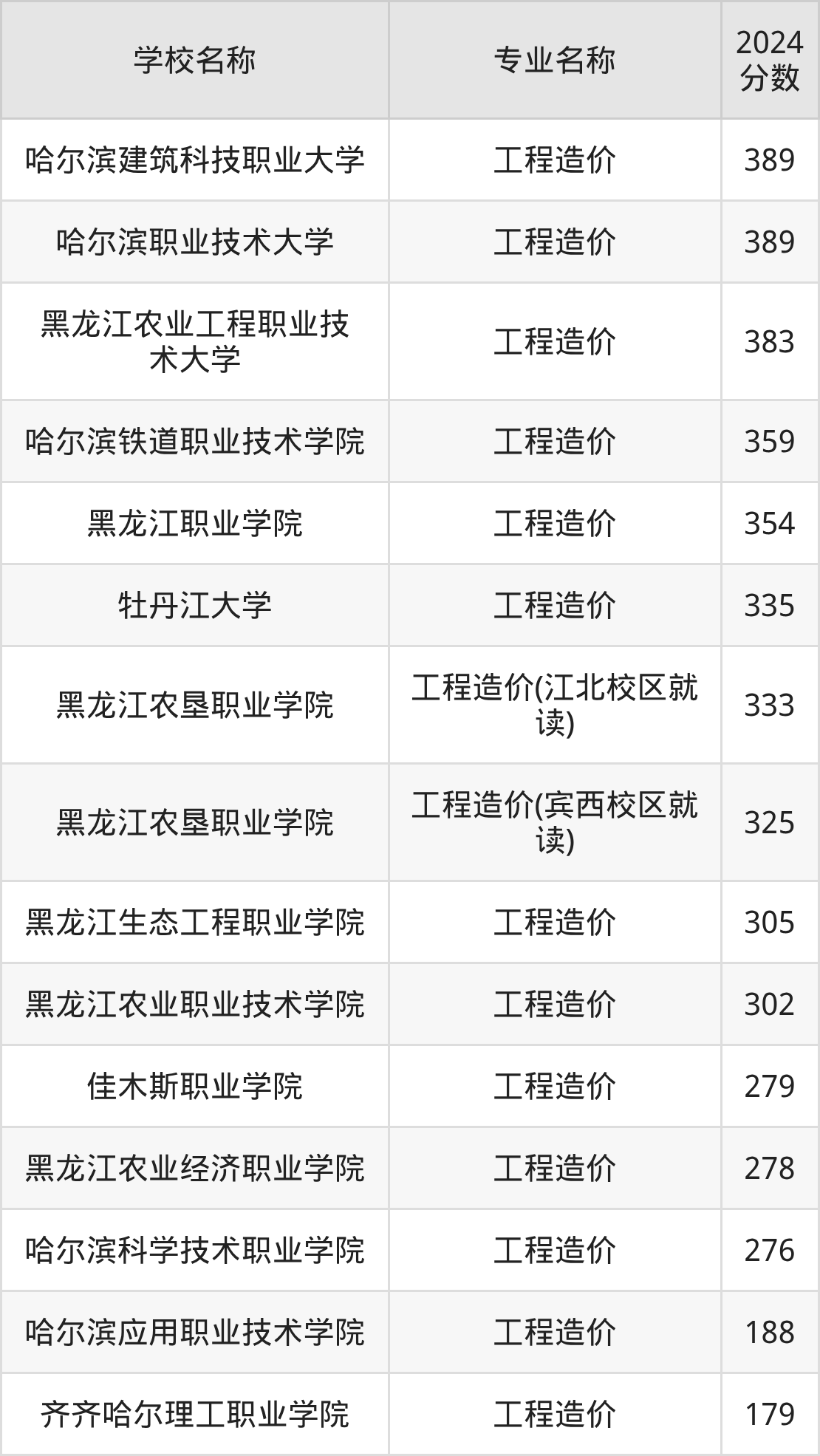 | 黑龙江职业学院 | 工程造价 | 329 |