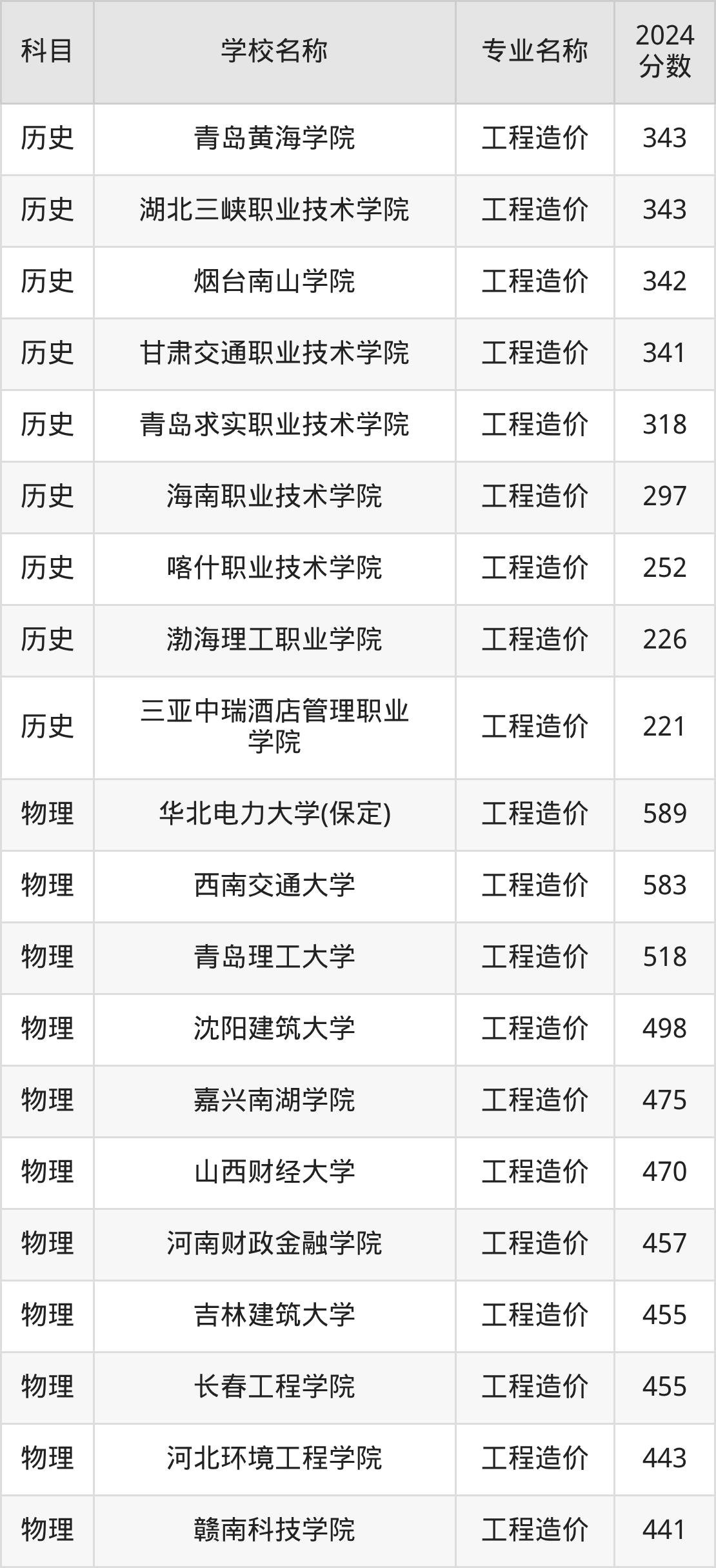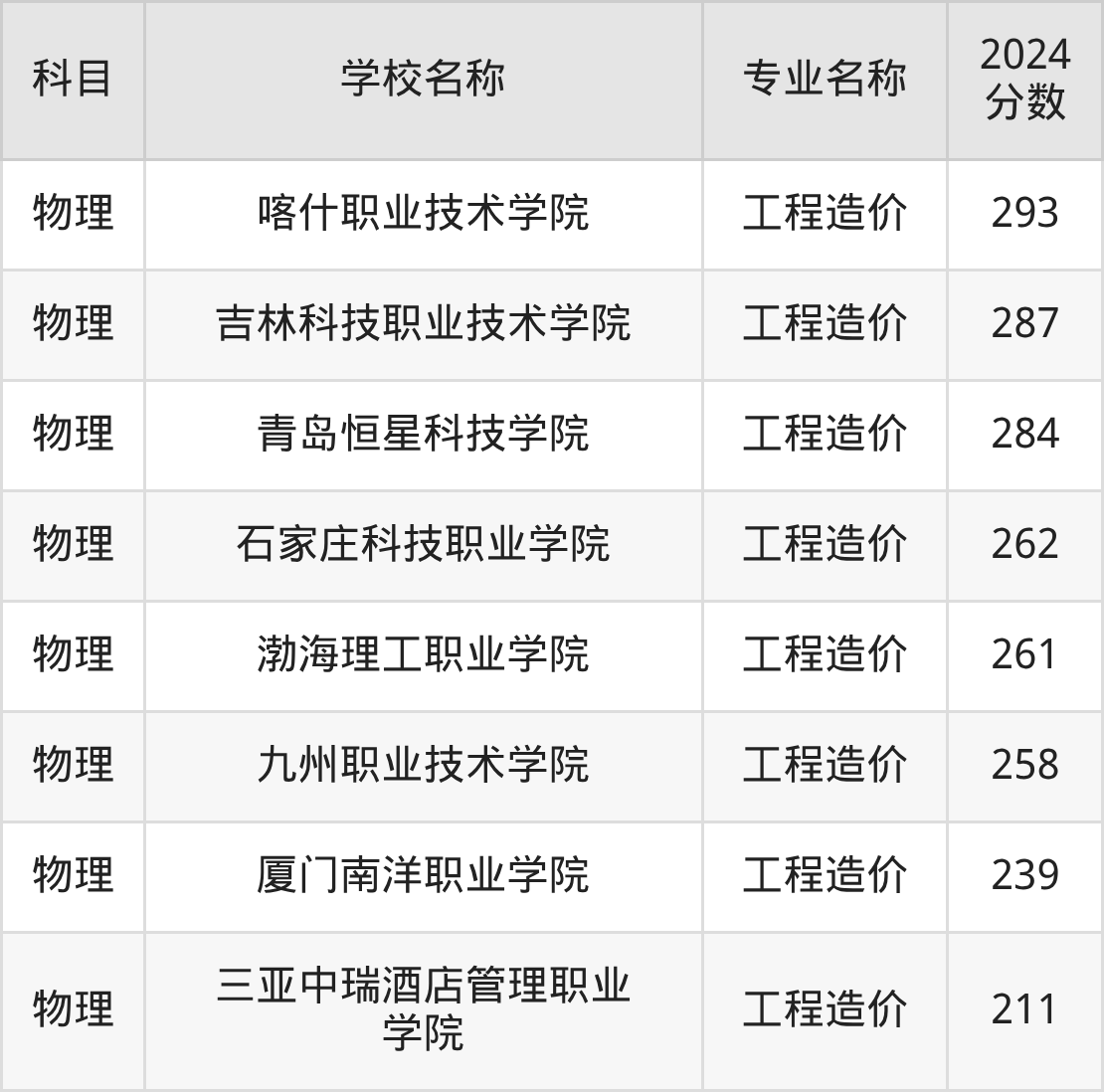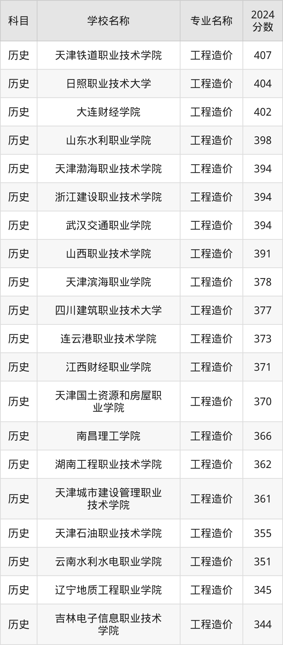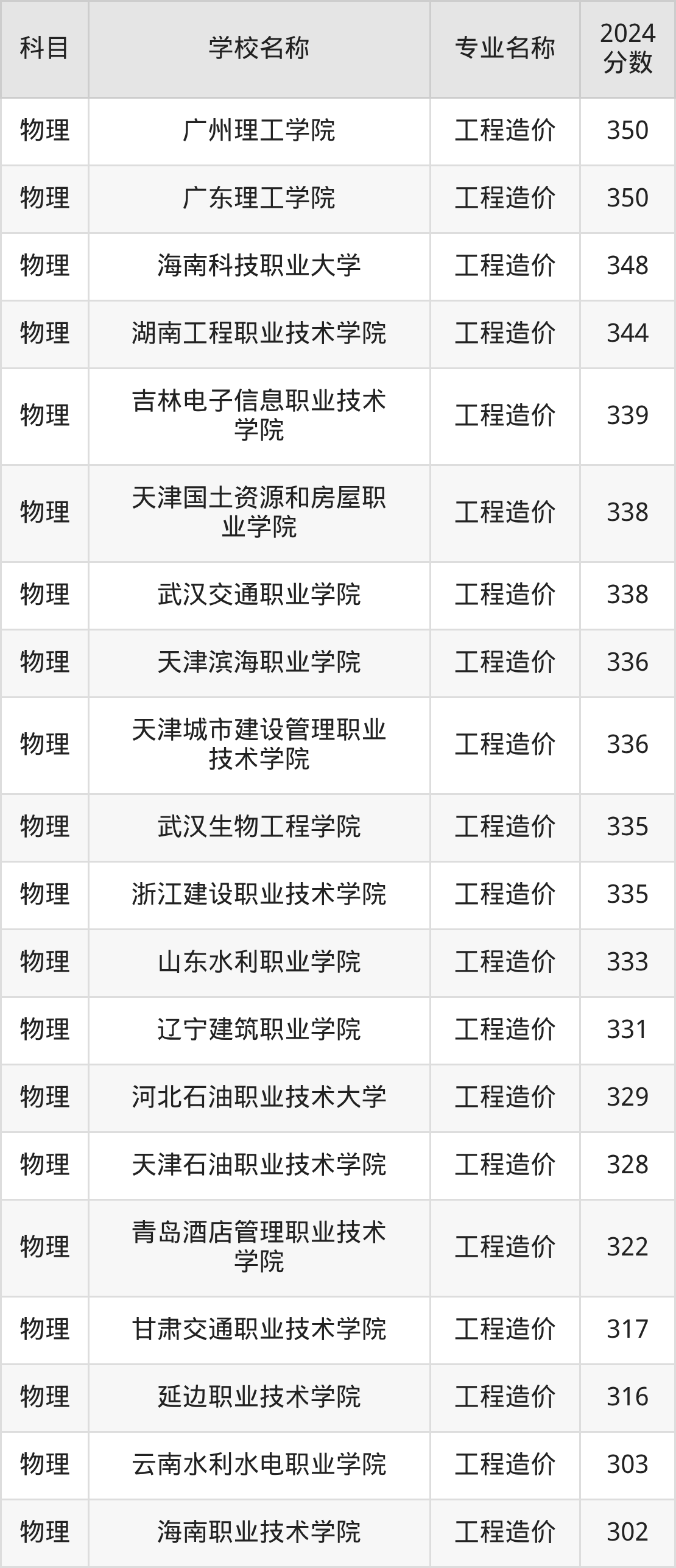 | 哈尔滨科学技术职业学 院 | 工程造价 | 296 |