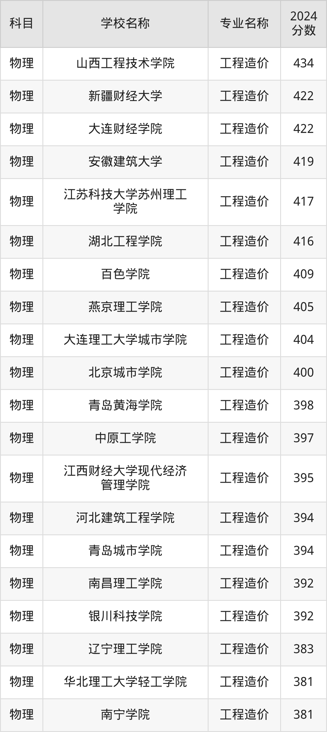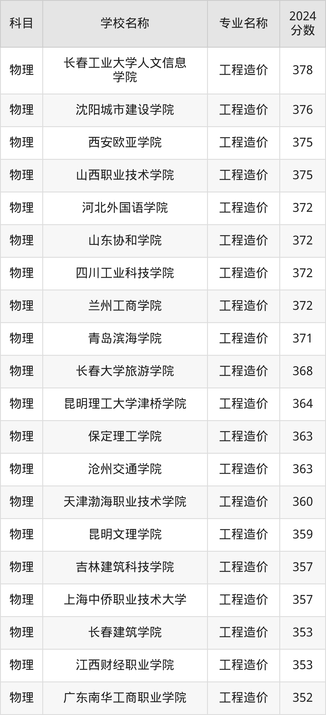 | 哈尔滨剑桥学院 | 工程造价 | 360 |