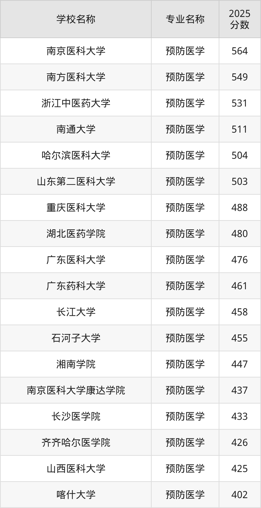 通过上文大家可以知晓,在上海市内招预防医学专业的院校数量较少,所以下文将为2026届高考生继续展示:市外大学的预防医学专业2025年在上海高考的录取情况,包含南京医科大学、南方医科大学、浙江中医药大学、南通大学、哈尔滨医科大学。