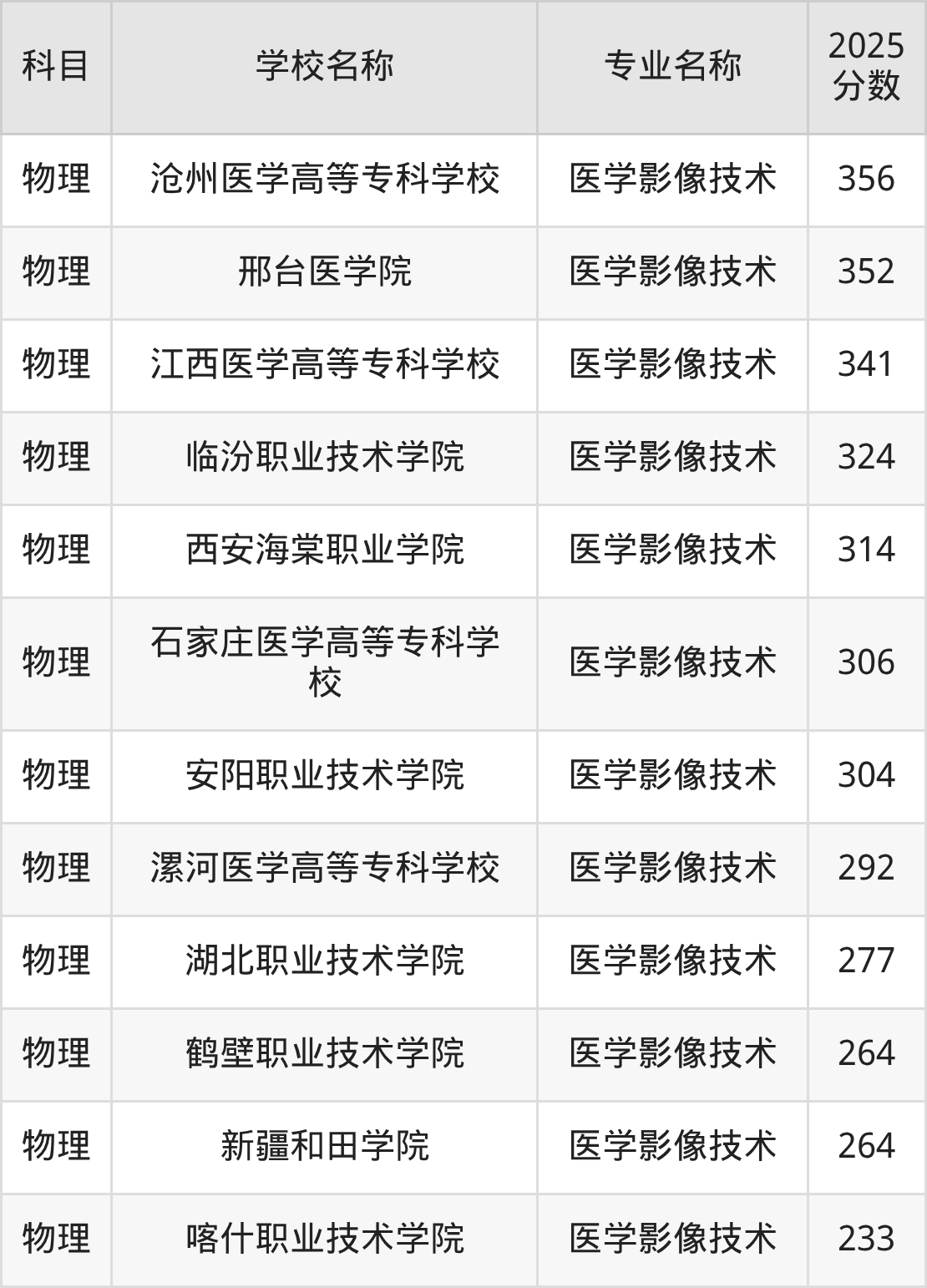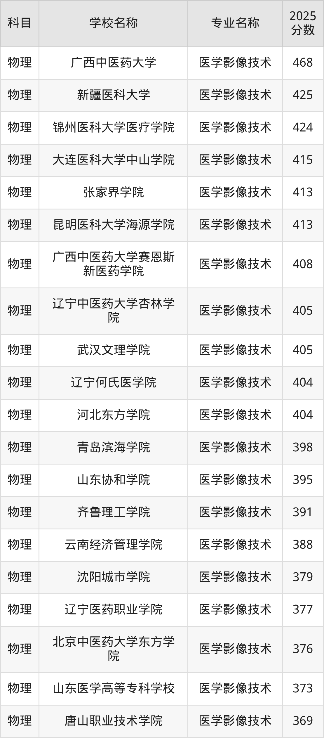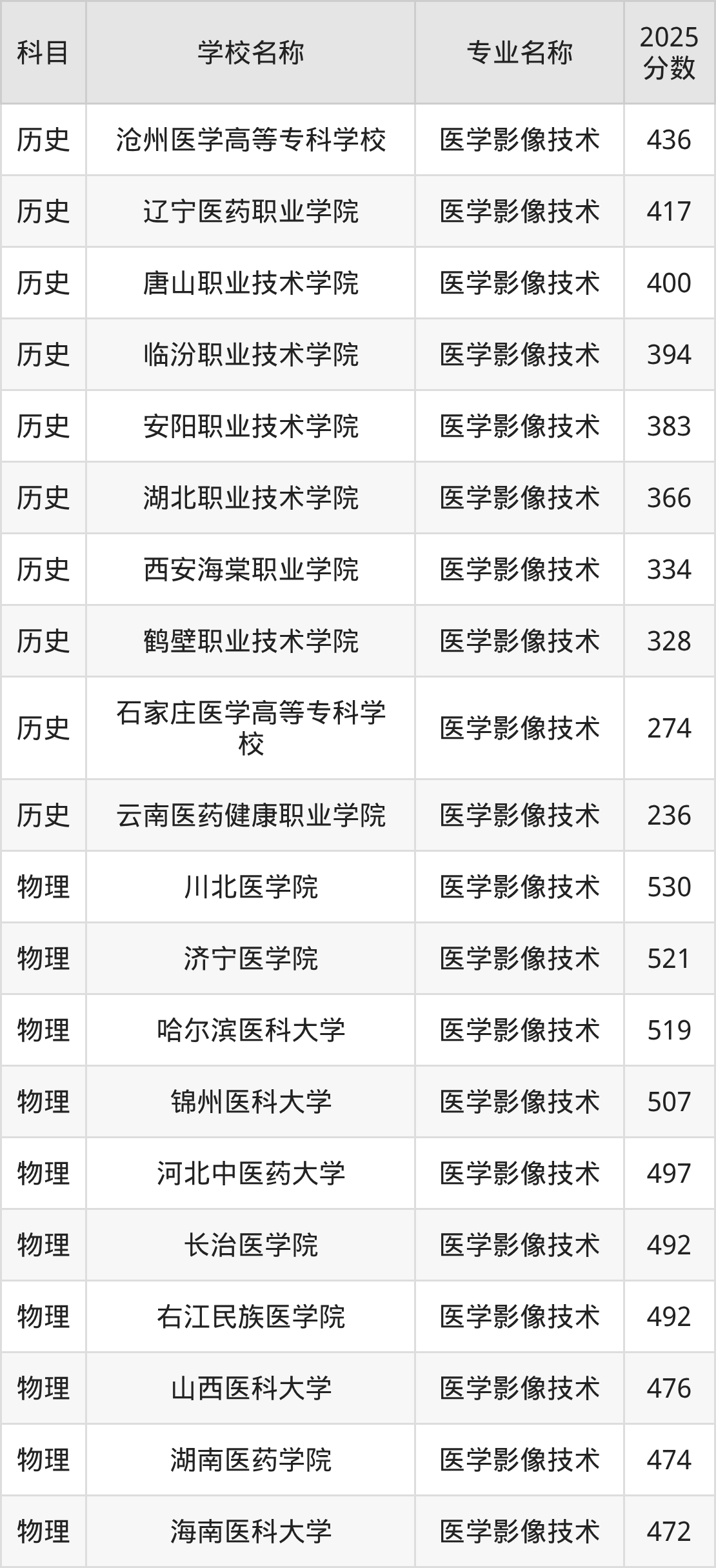 | 长春医学高等专科学校 | 医学影像技术 | 363 |