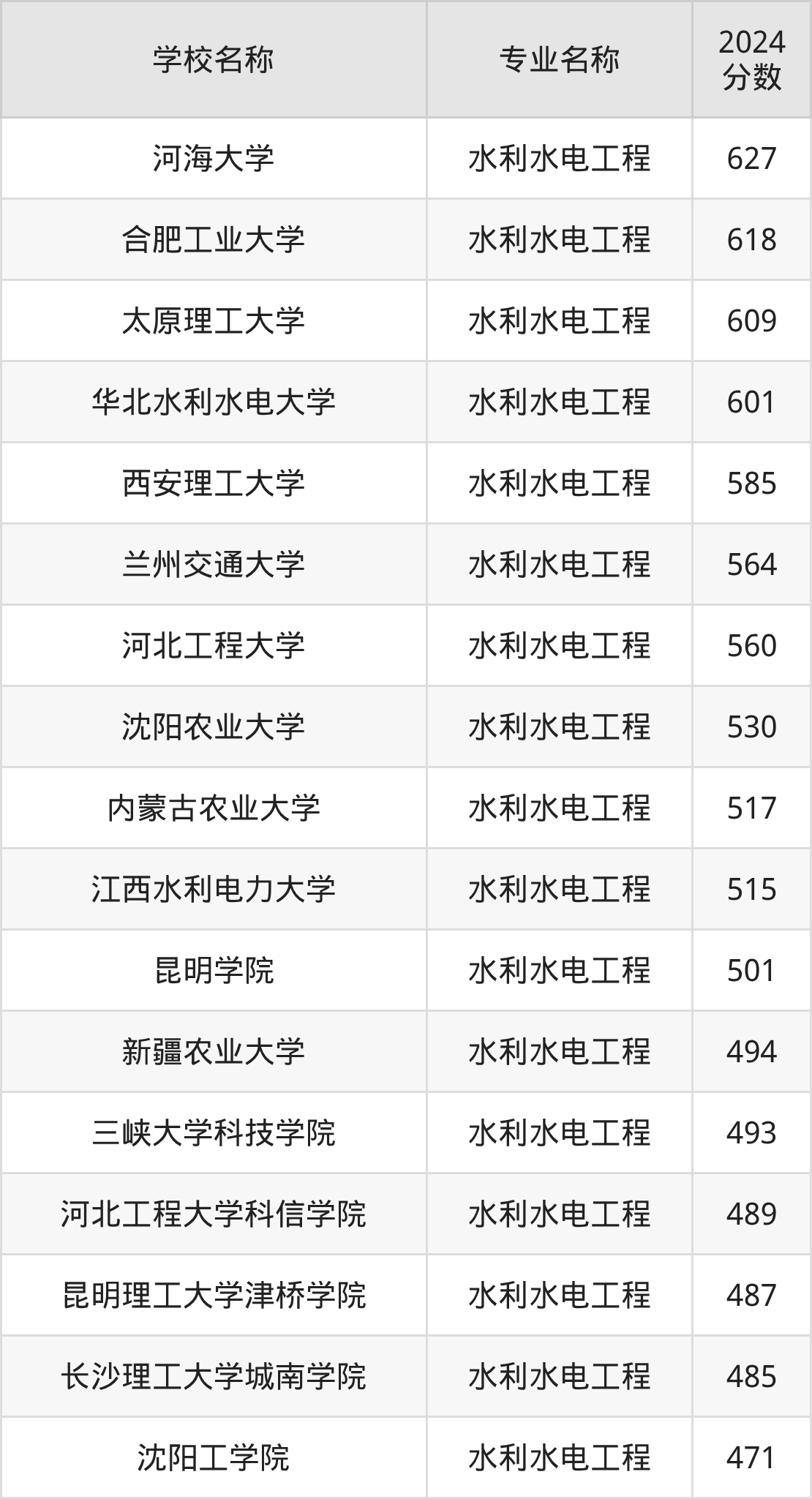通过上文大家可以知晓,在天津市内招水利水电工程专业的院校数量较少,所以下文将为2026届高考生继续展示:市外大学的水利水电工程专业2024年在天津高考的录取情况,包含河海大学、合肥工业大学、太原理工大学、华北水利水电大学、西安理工大学。