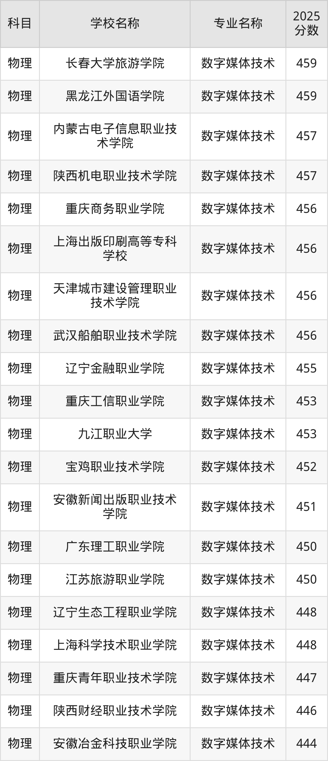 | 秦皇岛职业技术学院 | 数字媒体技术 | 459 |