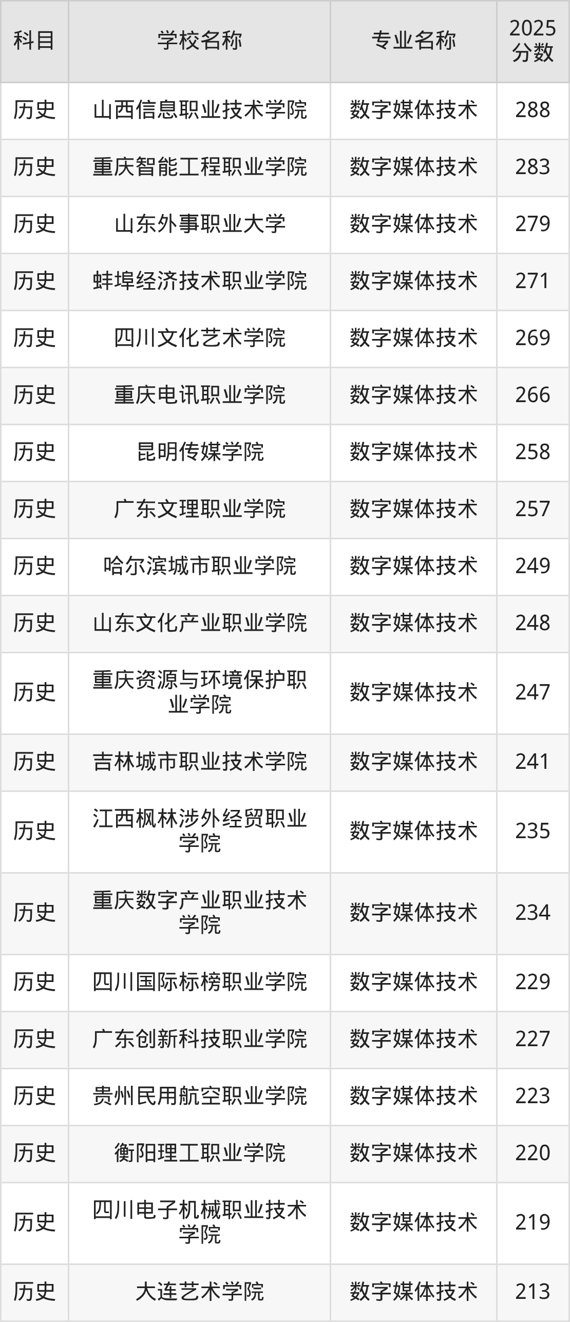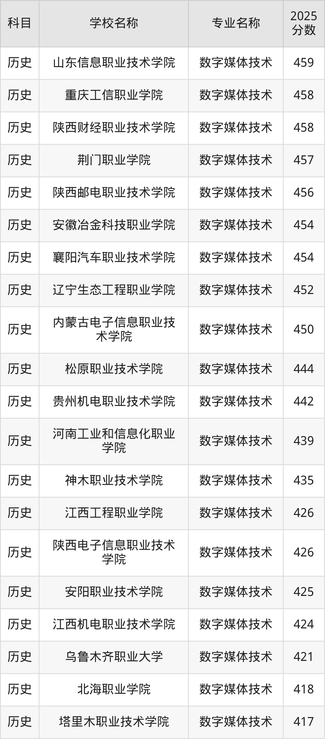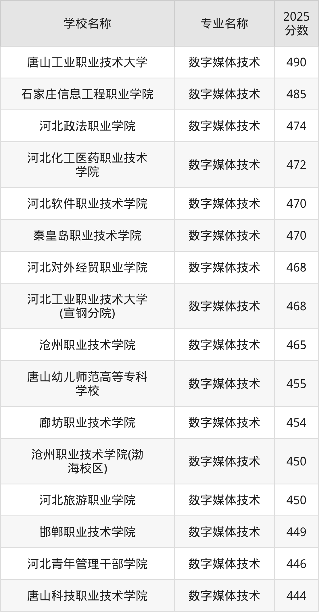 | 唐山科技职业技术学院 | 数字媒体技术 | 452 |