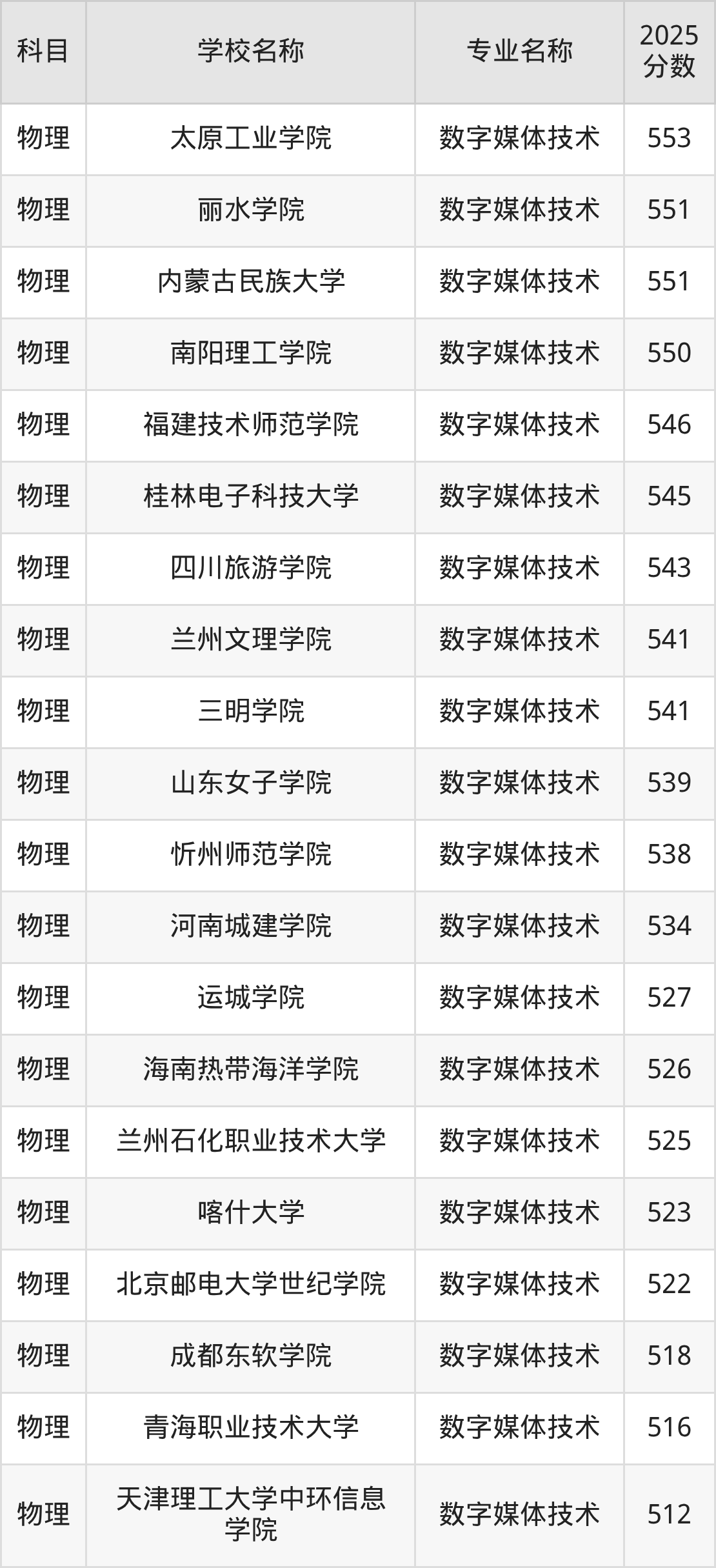 圆梦小编根据河北2025年高考物理组专业分,将开设了数字媒体技术专业且位于河北省内的大学按照“录取分”从高到低排序,得出了以上榜单。