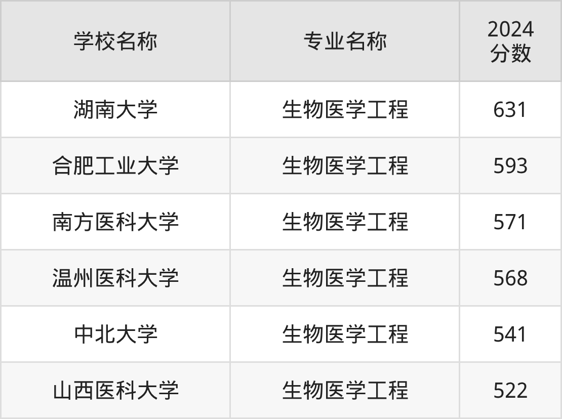 通过上文大家可以知晓,在北京市内招生物医学工程专业的院校数量较少,所以下文将为2026届高考生继续展示:市外大学的生物医学工程专业2024年在北京高考的录取情况,包含湖南大学、合肥工业大学、南方医科大学、温州医科大学、中北大学。