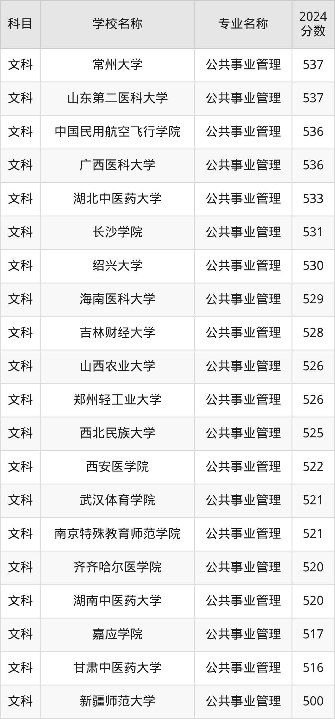 | 楚雄师范学院 | 公共事业管理 | 520 |