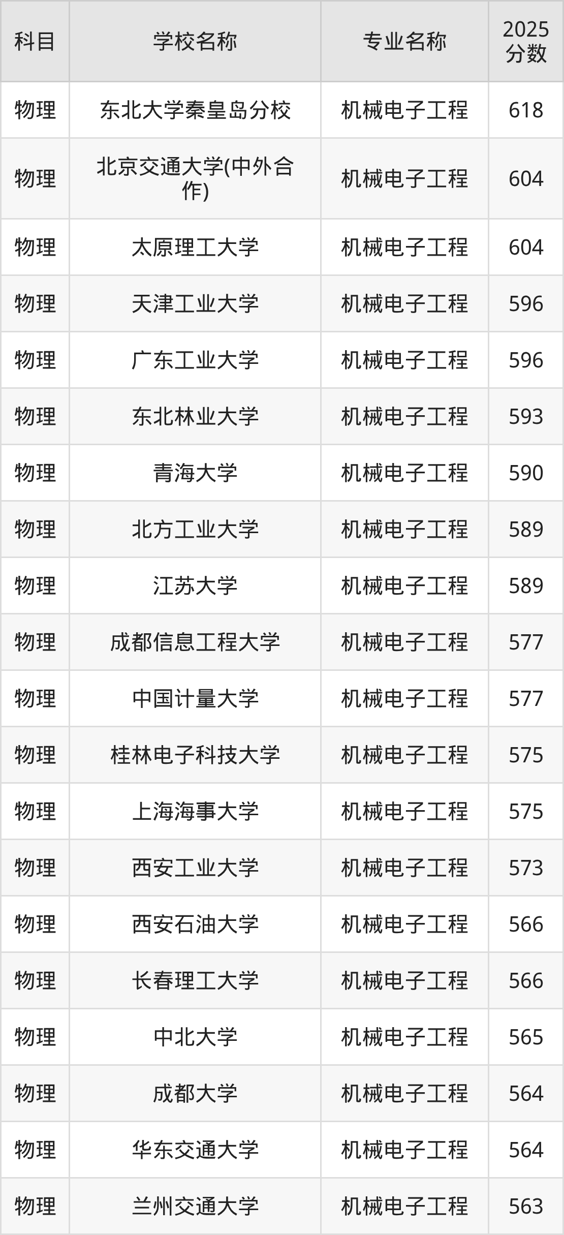 通过上文大家可以知晓,在重庆市内招机械电子工程专业的院校数量较少,所以下文将为2026届高考生继续展示:市外大学的机械电子工程专业2025年在重庆高考的录取情况,包含东北大学秦皇岛分校、北京交通大学(中外合作)、太原理工大学、天津工业大学、广东工业大学。