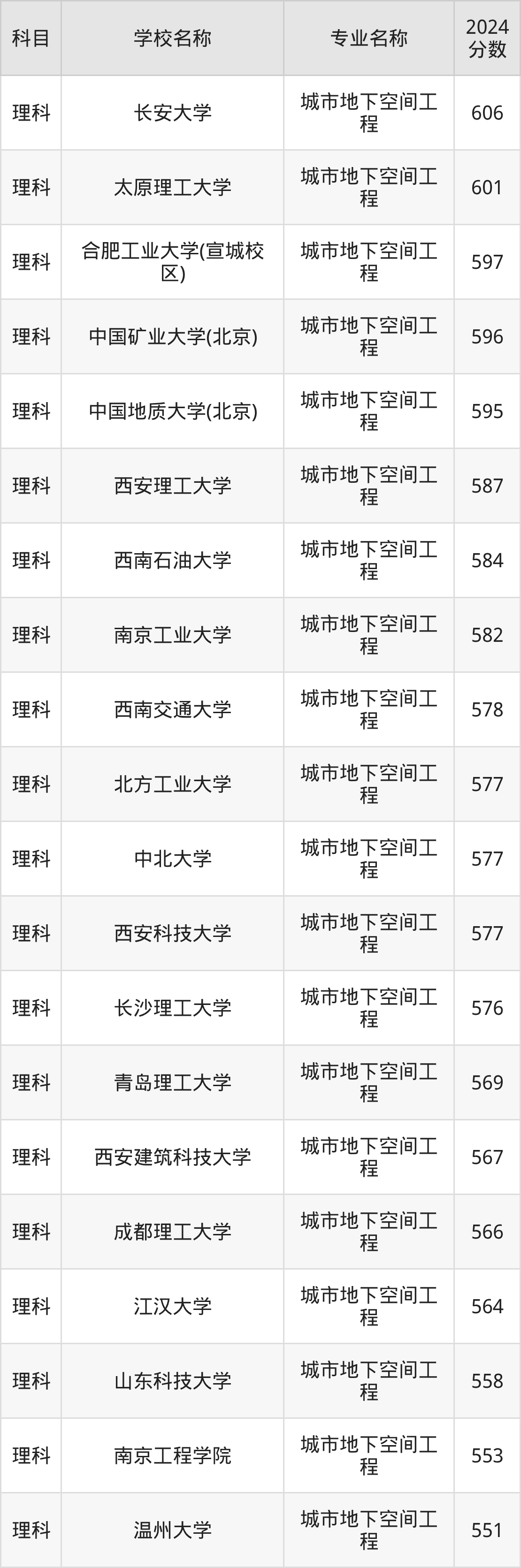 通过上文大家可以知晓,在河南省内招城市地下空间工程专业的院校数量较少,所以下文将为2026届高考生继续展示:省外大学的城市地下空间工程专业2024年在河南高考的录取情况,包含长安大学、太原理工大学、合肥工业大学(宣城校区)、中国矿业大学(北京)、中国地质大学(北京)。