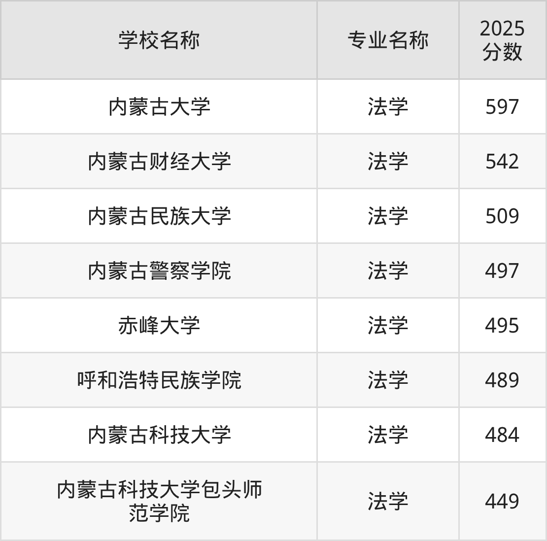 下文将为大家展示内蒙古自治区大学法学专业2025年在内蒙古高考的最低录取分数线!