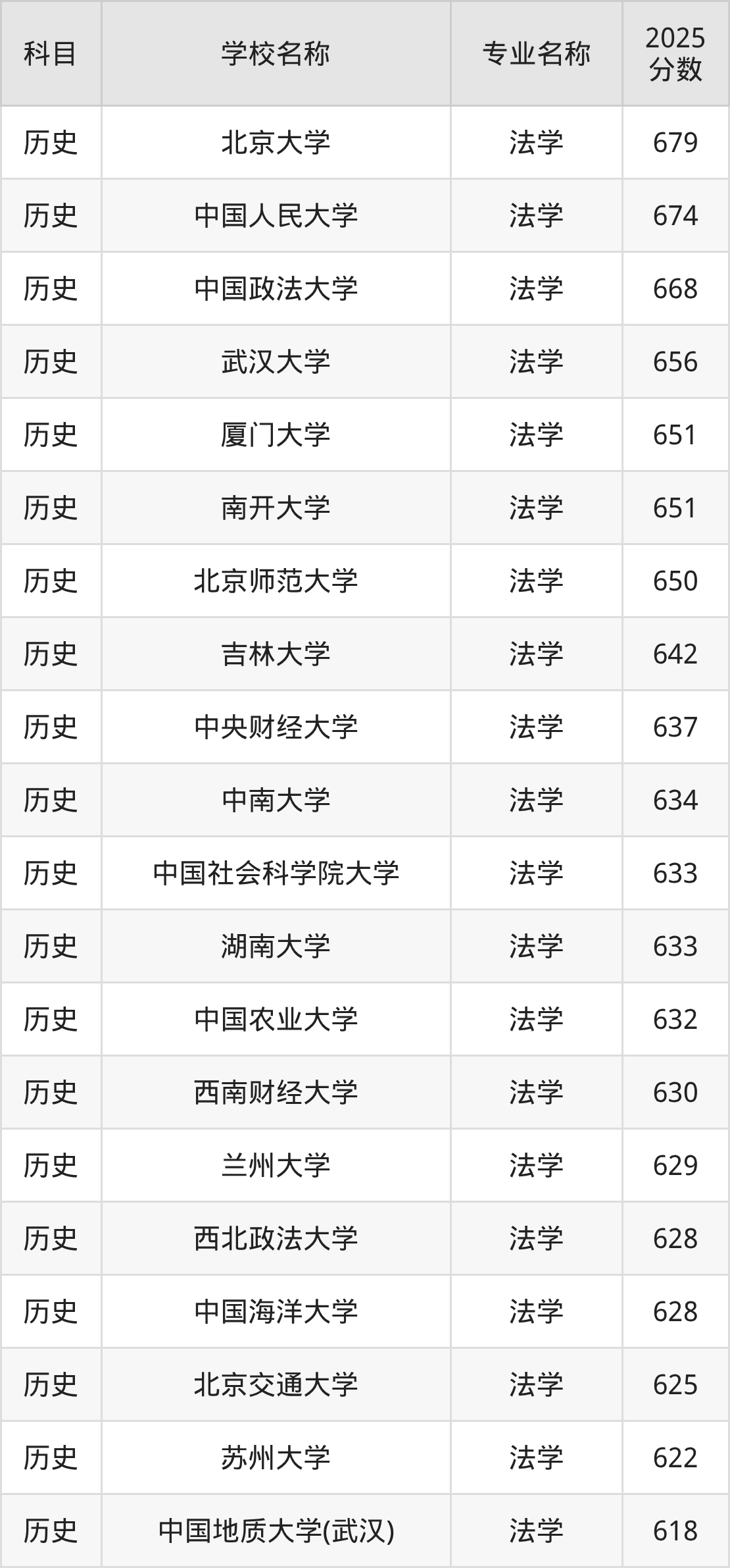 通过上文大家可以知晓,在内蒙古自治区内招法学专业的院校数量较少,所以下文将为2026届高考生继续展示:自治区外大学的法学专业2025年在内蒙古高考的录取情况,包含北京大学、中国人民大学、中国政法大学、武汉大学、厦门大学。