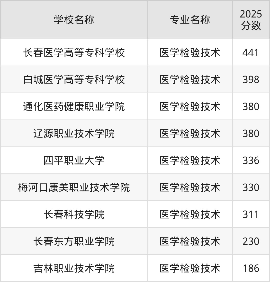 | 长春医学高等专科学校 | 医学检验技术 | 372 |