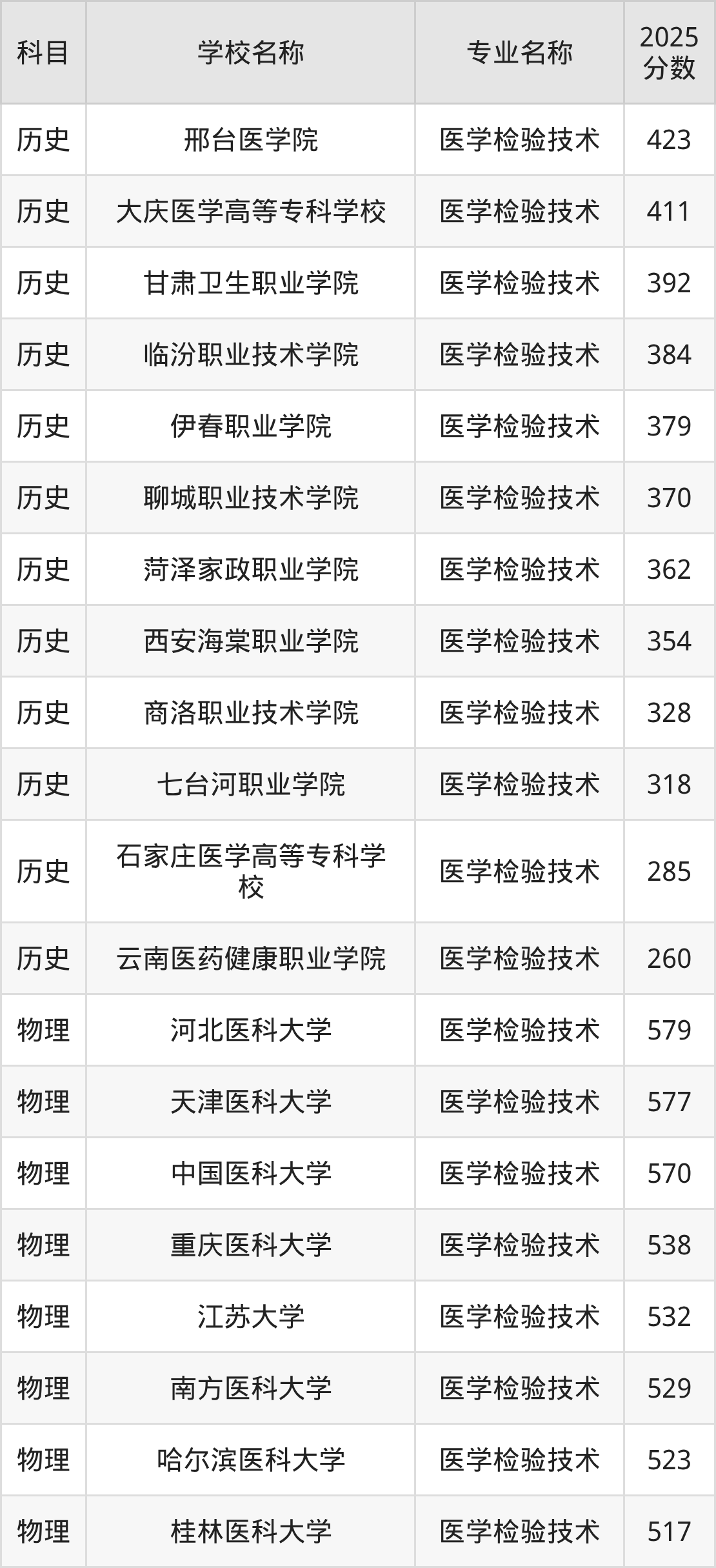 通过上文大家可以知晓,在吉林省内招医学检验技术专业的院校数量较少,所以下文将为2026届高考生继续展示:省外大学的医学检验技术专业2025年在吉林高考的录取情况,包含邢台医学院、大庆医学高等专科学校、甘肃卫生职业学院、临汾职业技术学院、伊春职业学院。
