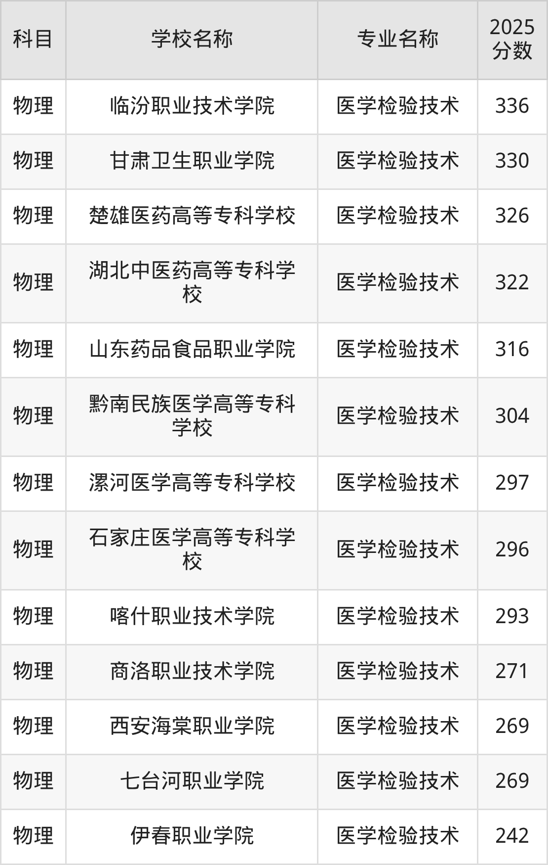 | 辽源职业技术学院 | 医学检验技术 | 330 |