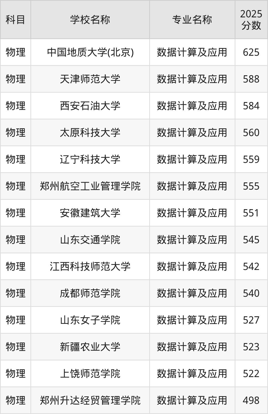 通过上文大家可以知晓,在河北省内招数据计算及应用专业的院校数量较少,所以下文将为2026届高考生继续展示:省外大学的数据计算及应用专业2025年在河北高考的录取情况,包含中国地质大学(北京)、天津师范大学、西安石油大学、太原科技大学、辽宁科技大学。