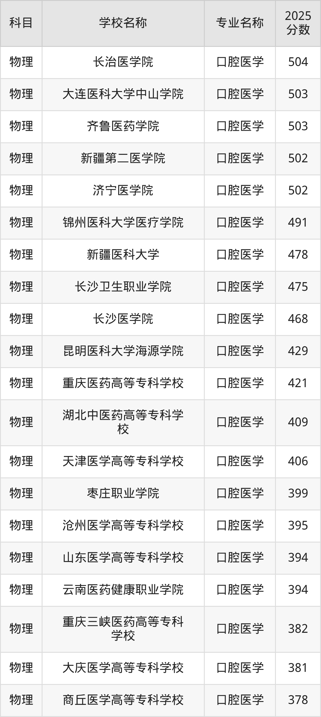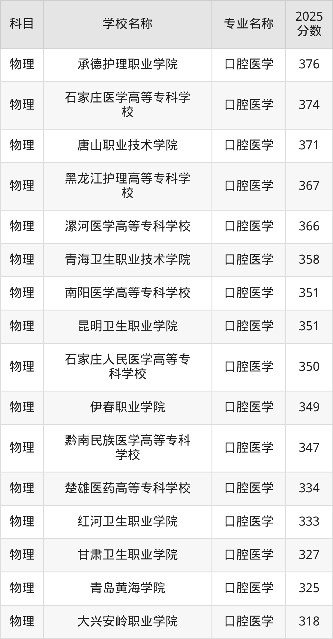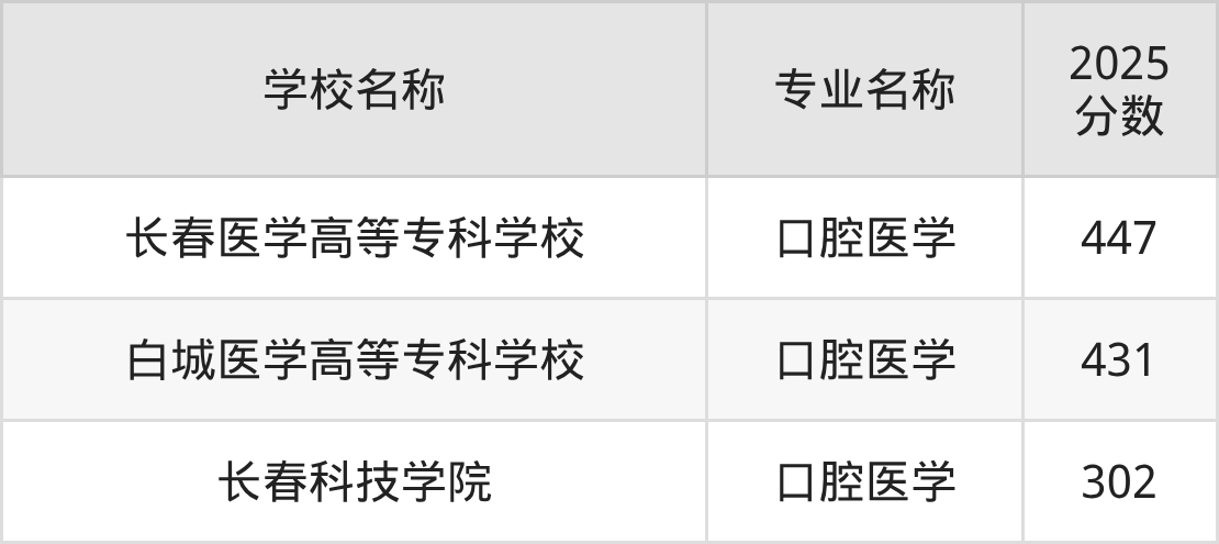 | 长春医学高等专科学校 | 口腔医学 | 382 |
