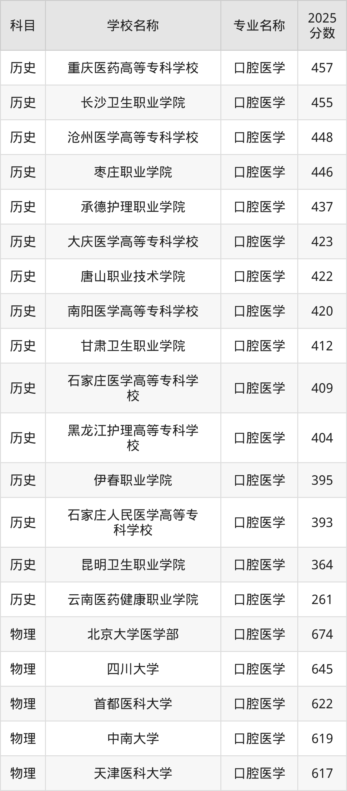 通过上文大家可以知晓,在吉林省内招口腔医学专业的院校数量较少,所以下文将为2026届高考生继续展示:省外大学的口腔医学专业2025年在吉林高考的录取情况,包含重庆医药高等专科学校、长沙卫生职业学院、沧州医学高等专科学校、枣庄职业学院、承德护理职业学院。