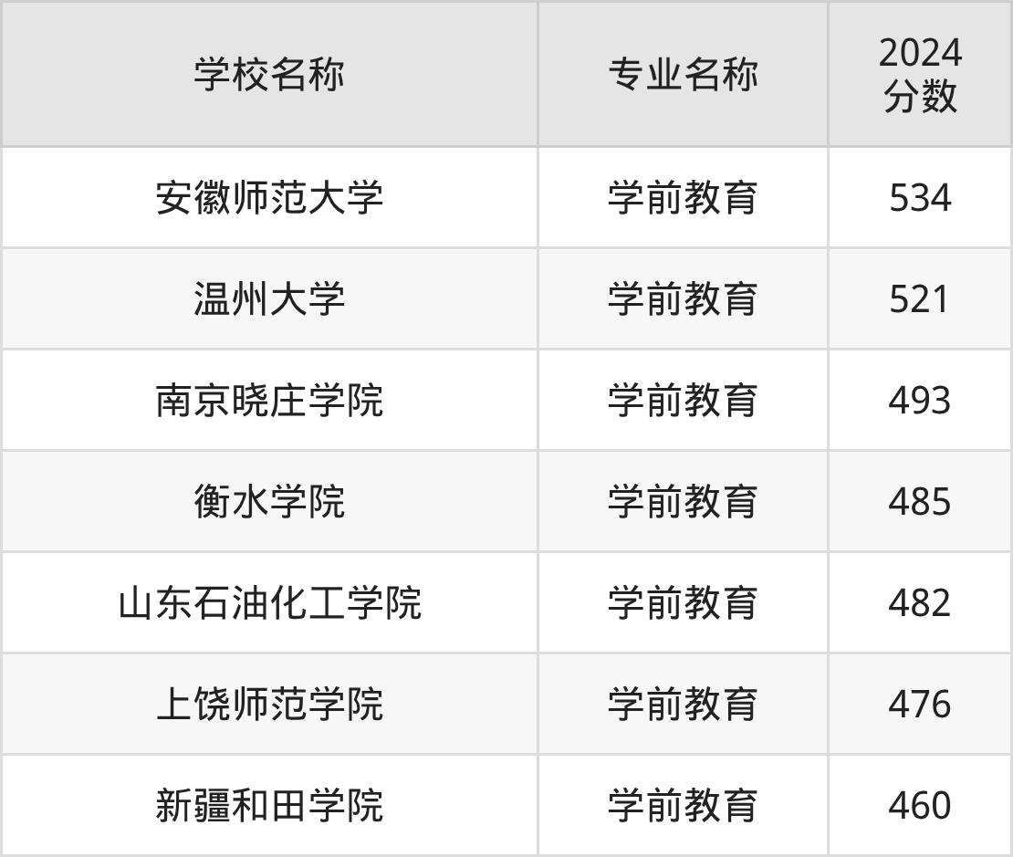 通过上文大家可以知晓,在北京市内招学前教育专业的院校数量较少,所以下文将为2026届高考生继续展示:市外大学的学前教育专业2024年在北京高考的录取情况,包含安徽师范大学、温州大学、南京晓庄学院、衡水学院、山东石油化工学院。