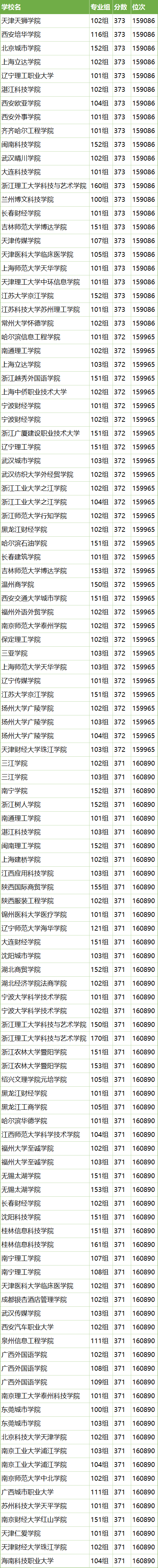 (1)372分:天津财经大学珠江学院、扬州大学广陵学院、三亚学院、上海师范大学天华学院、保定理工学院、为博主商学院、长春建筑学院、哈尔滨石油学院、浙江工业大学之江学院等,最低录取位次为第159965名;
