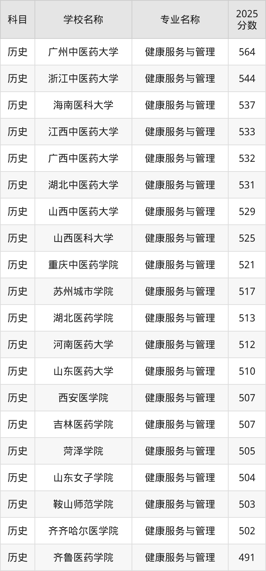 通过上文大家可以知晓,在贵州省内招健康服务与管理专业的院校数量较少,所以下文将为2026届高考生继续展示:省外大学的健康服务与管理专业2025年在贵州高考的录取情况,包含广州中医药大学、浙江中医药大学、海南医科大学、江西中医药大学、广西中医药大学。