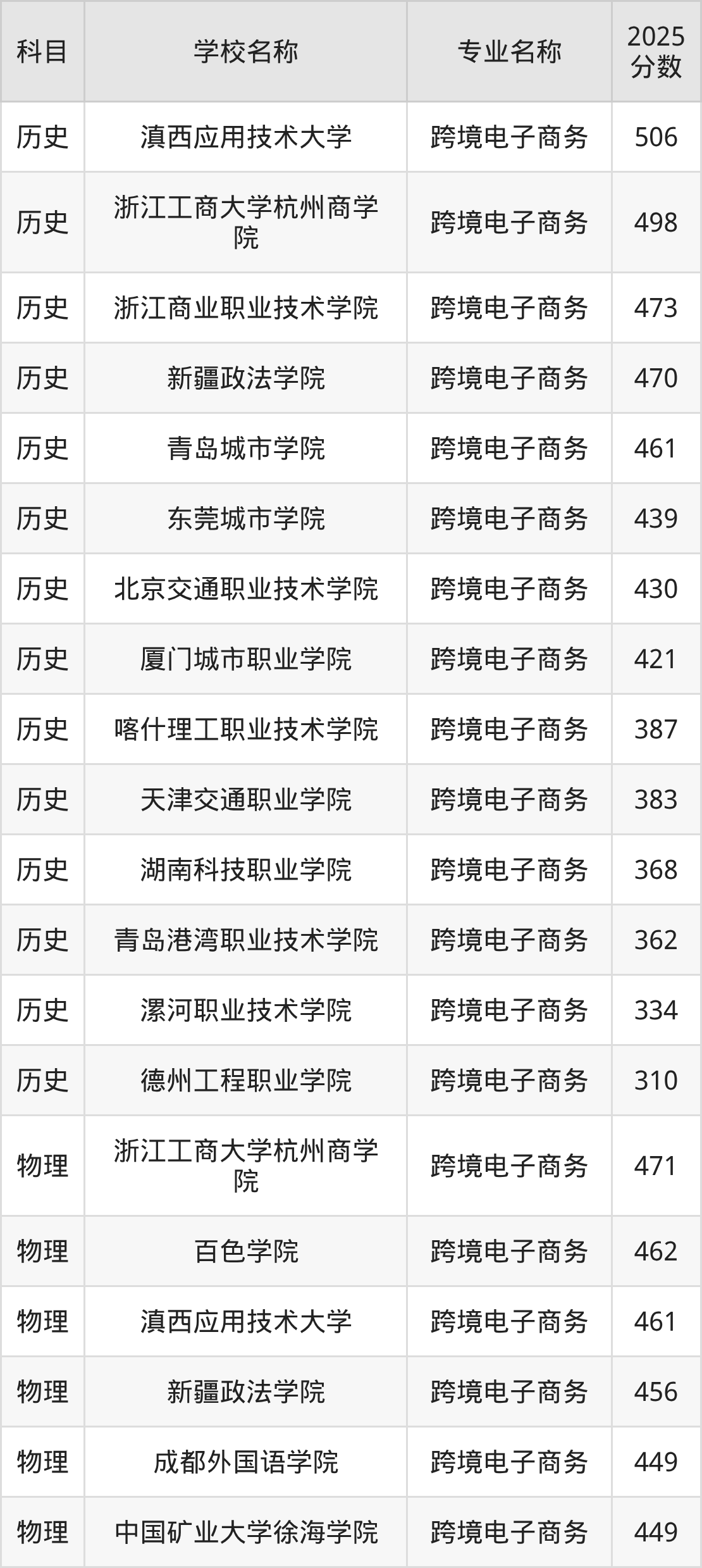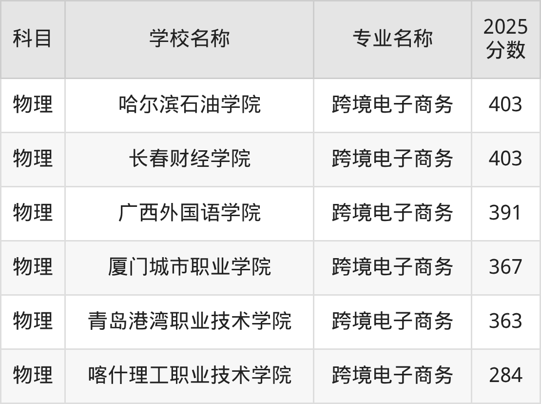 通过上文大家可以知晓,在辽宁省内招跨境电子商务专业的院校数量较少,所以下文将为2026届高考生继续展示:省外大学的跨境电子商务专业2025年在辽宁高考的录取情况,包含滇西应用技术大学、浙江工商大学杭州商学院、浙江商业职业技术学院、新疆政法学院、青岛城市学院。