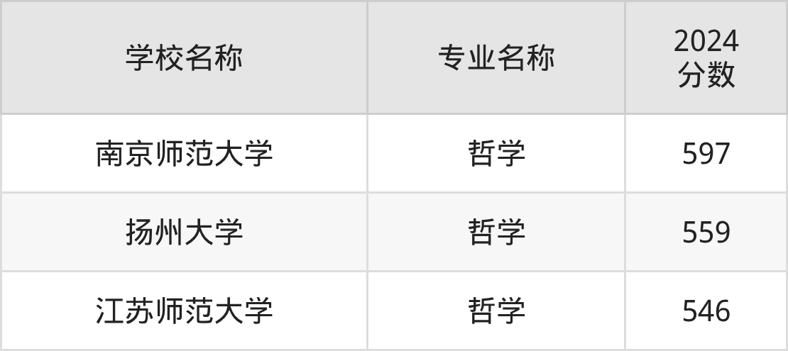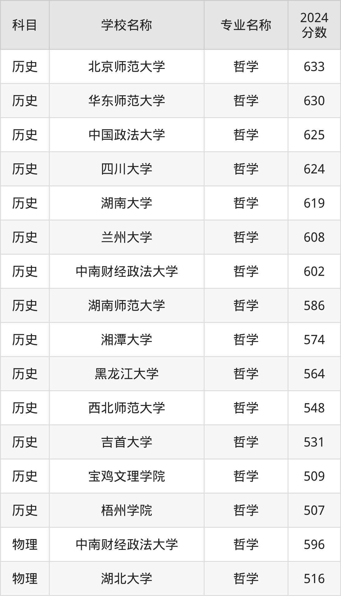 通过上文大家可以知晓,在江苏省内招哲学专业的院校数量较少,所以下文将为2026届高考生继续展示:省外大学的哲学专业2024年在江苏高考的录取情况,包含北京师范大学、华东师范大学、中国政法大学、四川大学、湖南大学。