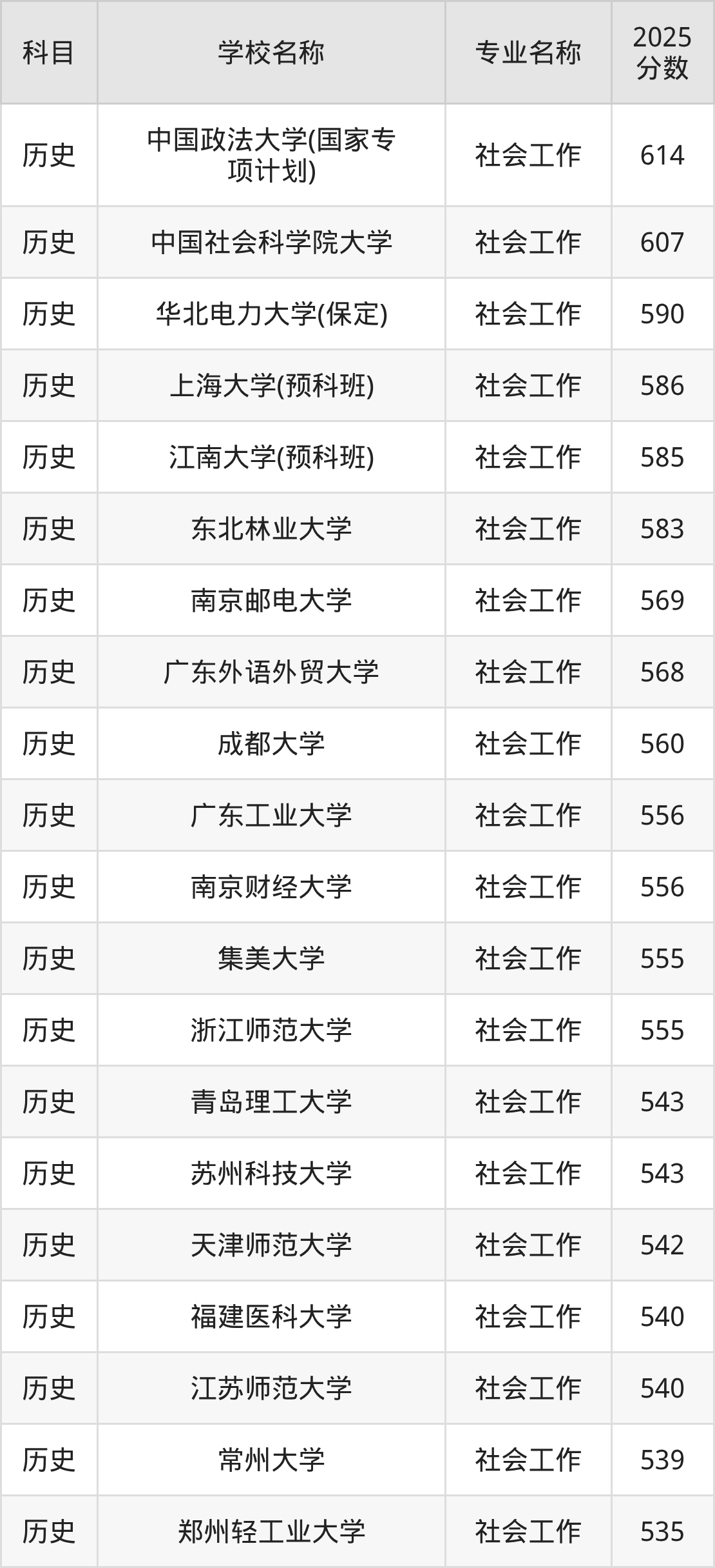 通过上文大家可以知晓,在贵州省内招社会工作专业的院校数量较少,所以下文将为2026届高考生继续展示:省外大学的社会工作专业2025年在贵州高考的录取情况,包含中国政法大学(国家专项计划)、中国社会科学院大学、华北电力大学(保定)、上海大学(预科班)、江南大学(预科班)。