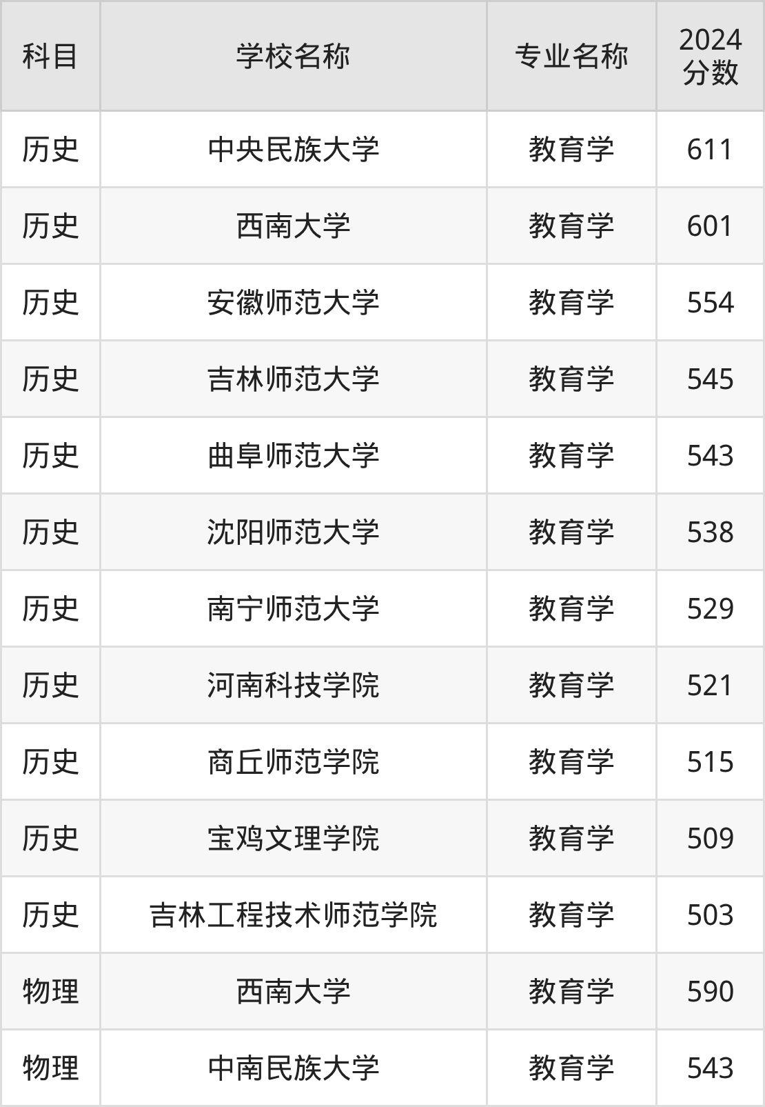 通过上文大家可以知晓,在江苏省内招教育学专业的院校数量较少,所以下文将为2026届高考生继续展示:省外大学的教育学专业2024年在江苏高考的录取情况,包含中央民族大学、西南大学、安徽师范大学、吉林师范大学、曲阜师范大学。