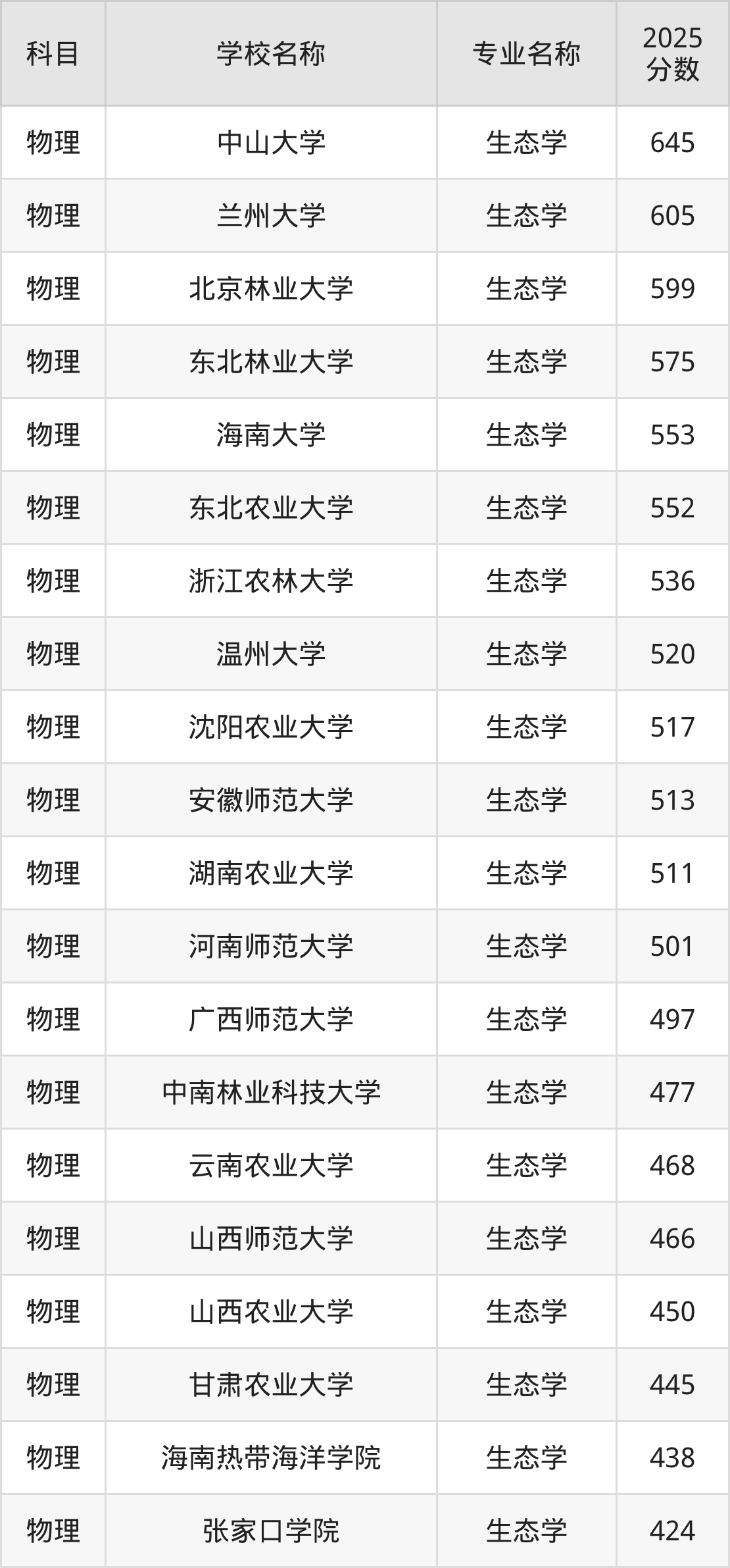 通过上文大家可以知晓,在内蒙古自治区内招生态学专业的院校数量较少,所以下文将为2026届高考生继续展示:自治区外大学的生态学专业2025年在内蒙古高考的录取情况,包含中山大学、兰州大学、北京林业大学、东北林业大学、海南大学。