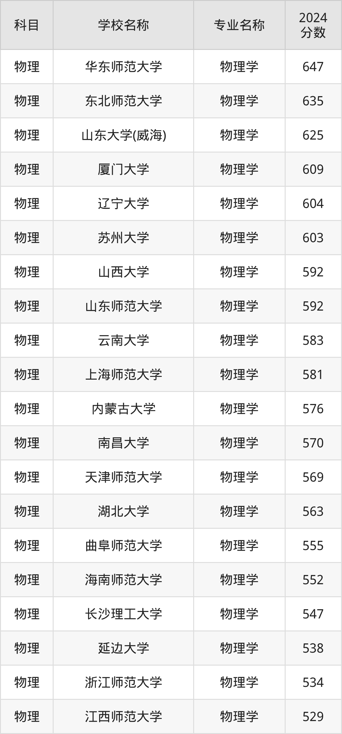 通过上文大家可以知晓,在黑龙江省内招物理学专业的院校数量较少,所以下文将为2026届高考生继续展示:省外大学的物理学专业2024年在黑龙江高考的录取情况,包含华东师范大学、东北师范大学、山东大学(威海)、厦门大学、辽宁大学。