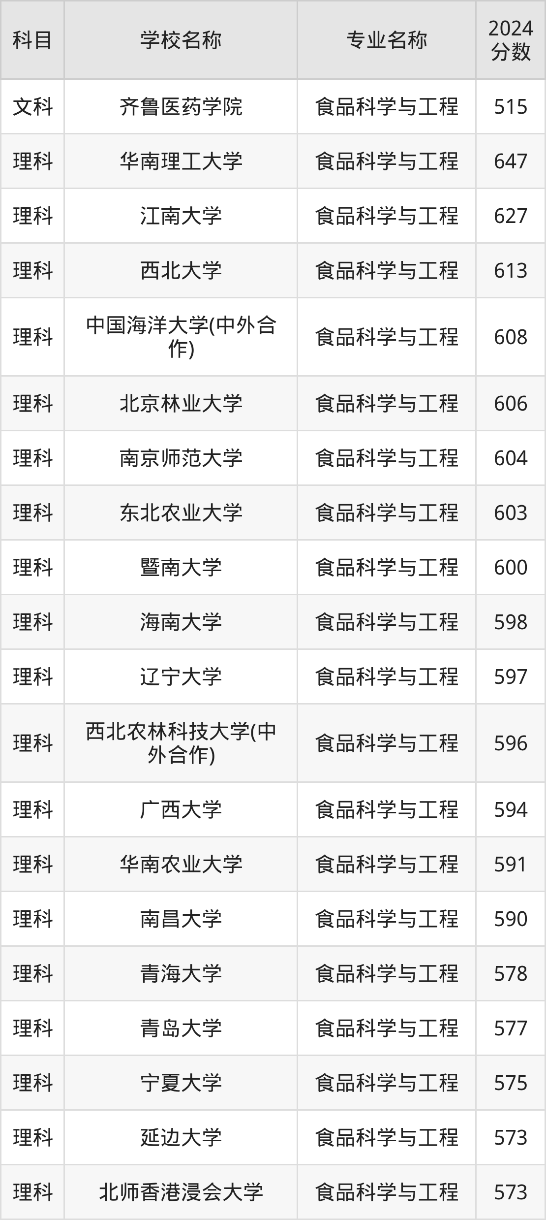 通过上文大家可以知晓,在四川省内招食品科学与工程专业的院校数量较少,所以下文将为2026届高考生继续展示:省外大学的食品科学与工程专业2024年在四川高考的录取情况,包含齐鲁医药学院、华南理工大学、江南大学、西北大学、中国海洋大学(中外合作)。